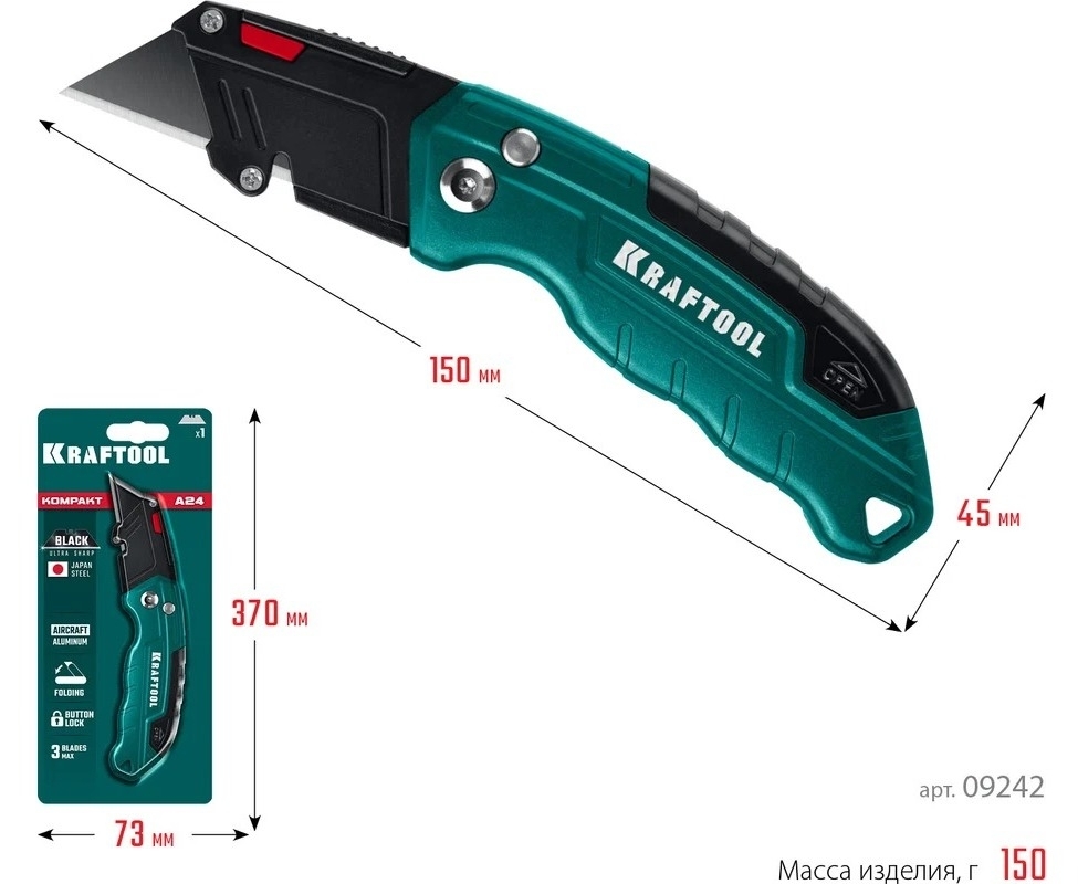 Нож строительный KRAFTOOL / Крафтул Helfer тип F24 складной с трапециевидным лезвием, из стали SK5, зеленый, 150мм / инструменты