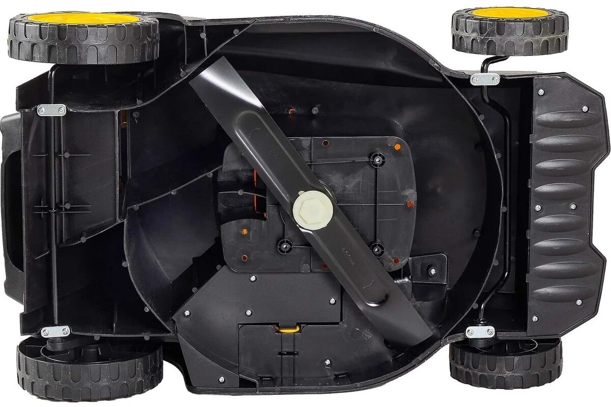 Данная модель оснащена мощным электродвигателем на 1800 Вт и прочными стальными ножами. Высоту среза можно отрегулировать в пределах от 20 до 55 мм, что облегчает индивидуальный подход к обработке газона. Для регулировки высоты ножей и управления устройством используется рычаг, расположенный непосредственно на ручке.