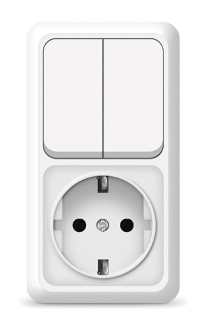— Состоит из одной розетки и одного двуклавишного выключателя. .