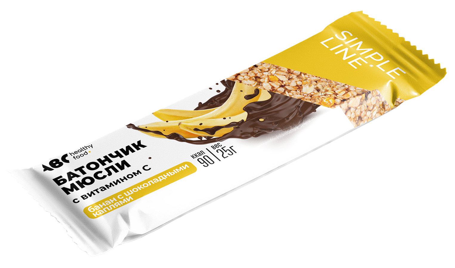 Батончик мюсли злаковый ABC healthy food / АВС Хэлси фуд банан с шоколадными каплями, с витамином С, 25г / здоровый перекус