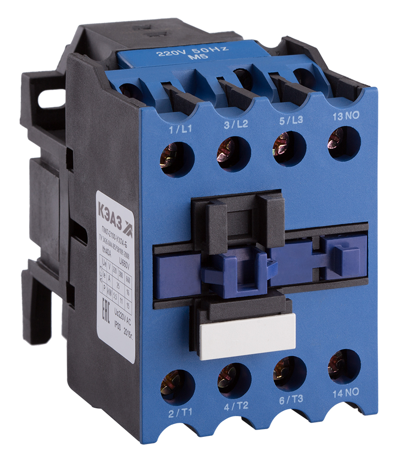 Контактор с катушкой управления переменным током напряжением 220 В на номинальный ток 25 А.
