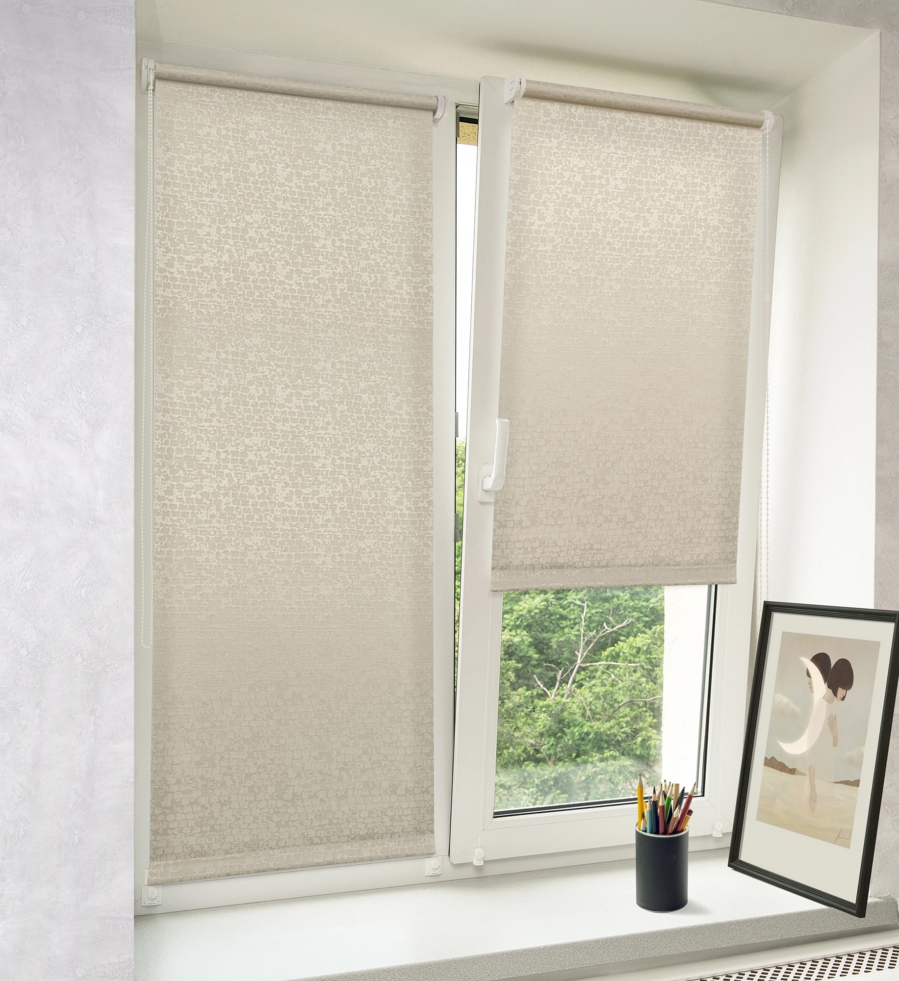 Штора рулонная регулирует освещение комнаты, опускается до любого желаемого уровня. Воздушная прослойка между стеклом и шторами защищает летом от чрезмерного нагревания помещения, а зимой от проникновения холодного воздуха. Специальная антистатическая пропитка ткани облегчает уход и защищает от пыли и загрязнений.
