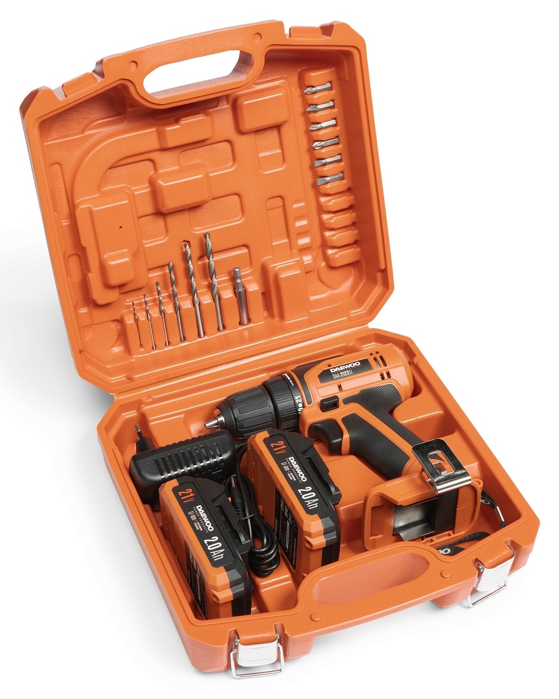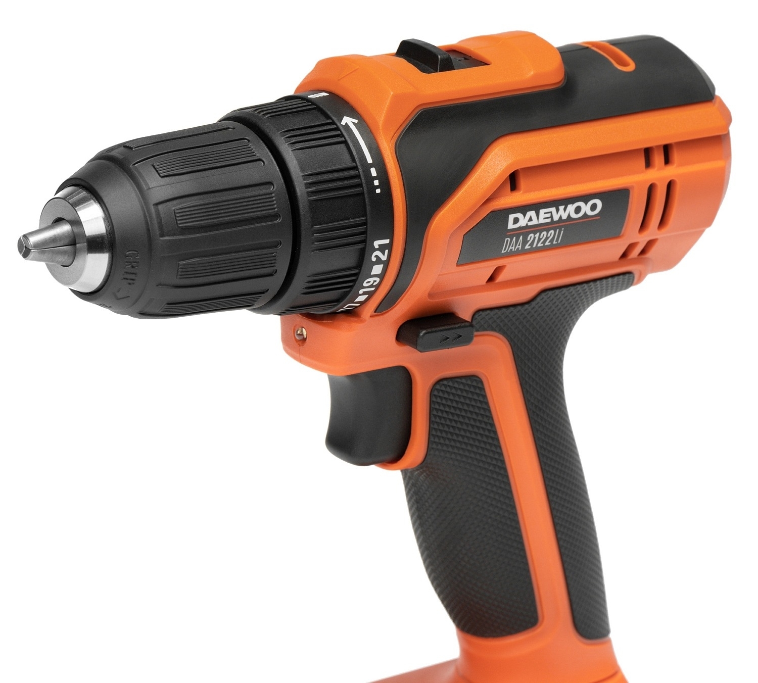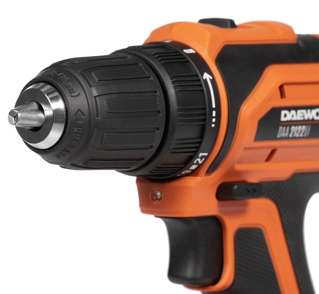 инструментами и батареями DAEWOO линейки 21В. Быстрозажимной патрон. Обеспечивает быструю установку оснастки диаметром хвостовика 0,8-10 мм и надежную ее фиксацию во время работы. Два аккумулятора 21В/2 Ач и зарядное устройство уже в комплекте. Вы сразу можете приступить к работе. 12 аксессуаров в комплекте.
