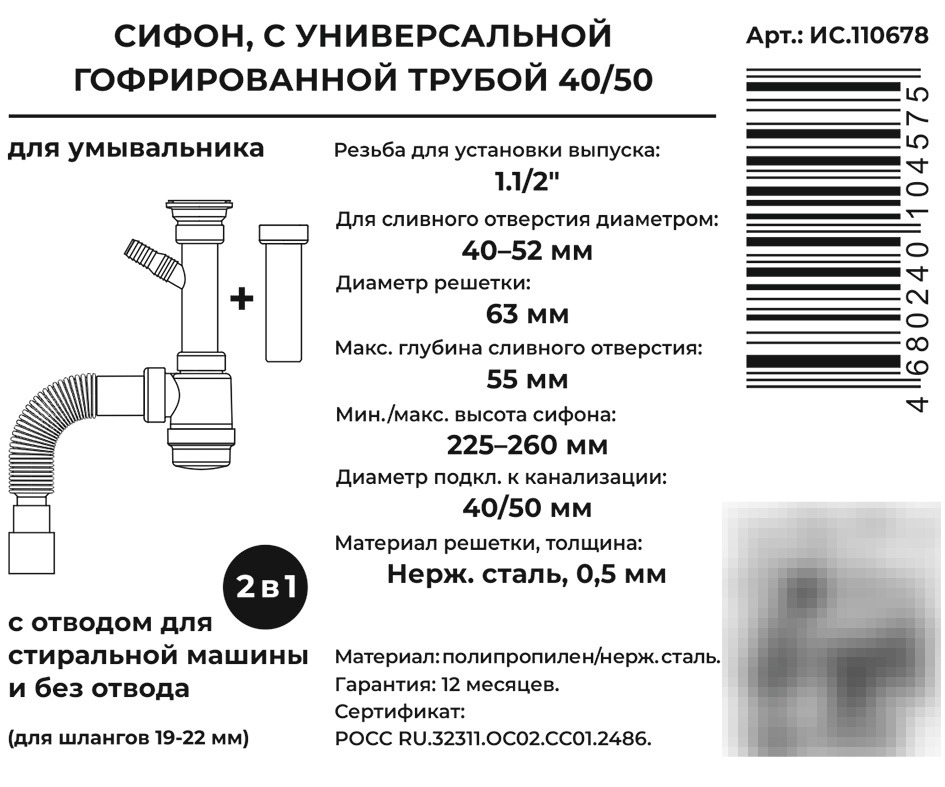 Сифон для раковин и умывальников с литым выпуском, нержавеющей решеткой и гибкой трубой. Диаметр решётки выпуска 63 мм. Размер выпуска (входное отверстие) 1 1/2. Диаметр сливного отверстия 40 мм. Отвод в канализацию 40/50 мм. Величина гидрозатвора 55 мм. Комплектация: корпус сифона, сливная решетка из нержавеющей стали, гибкая труба. Материал - полипропилен.