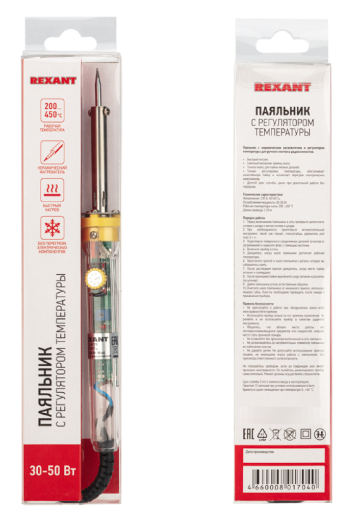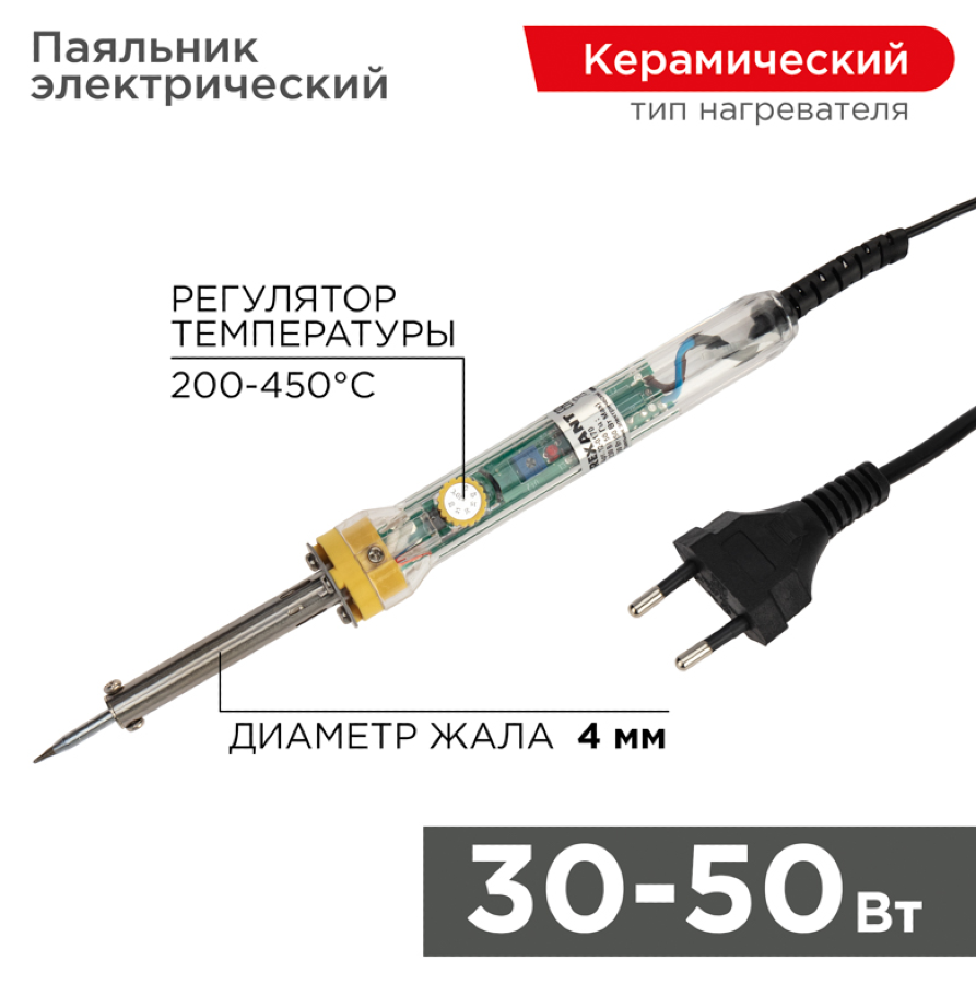 - Паяльник электрический REXANT с керамическим нагревателем и регулировкой температуры, 50Вт, нагрев за 300с, 12-0170 - 1шт.