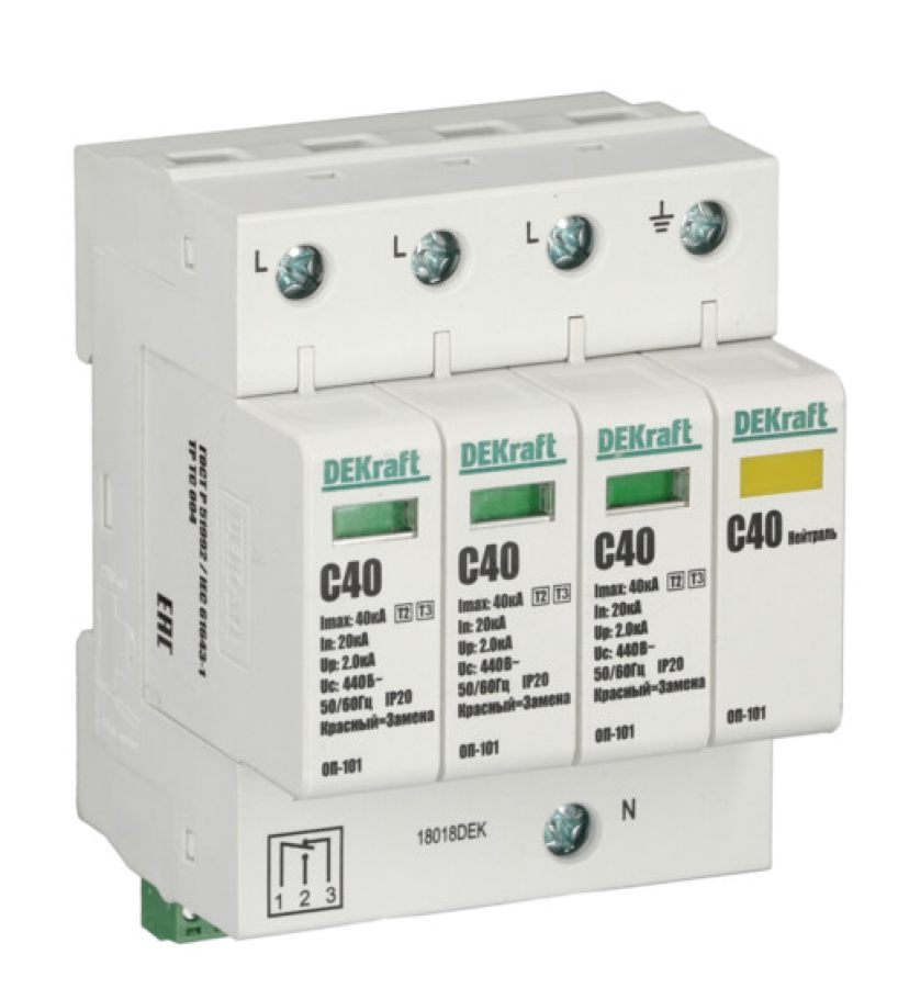- Ограничитель перенапряжения DEKraft ОП-101 модульный, 3P+N, 440В 2кВ 40кА - 1шт.