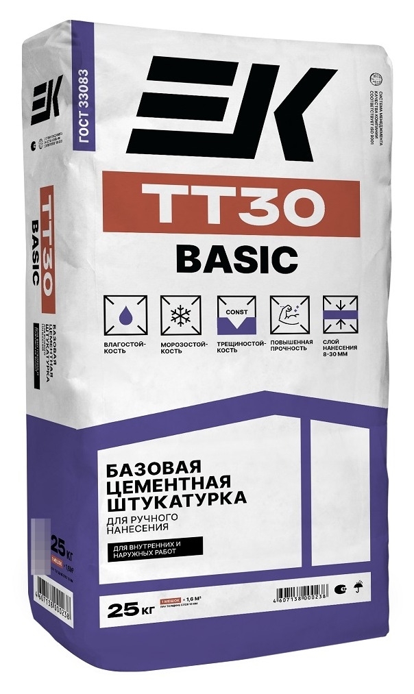 Штукатурка цементная ЕК TT30 BASIC для наружных и внутренних работ, повышенная прочность, трещиностойкая, серая, 25кг / строительные смеси