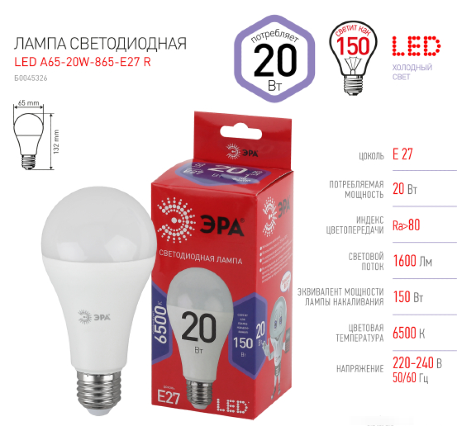 Основные характеристики лампы светодиодной ЭРА: