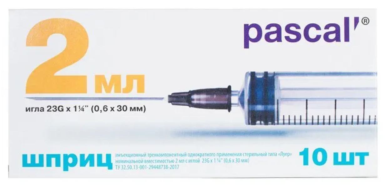 Pascal' / Паскаль Шприц медицинский одноразовый стерильный трехкомпонентный с иглой 23G 0.6х30мм 2мл, 10шт. / медицинское изделие