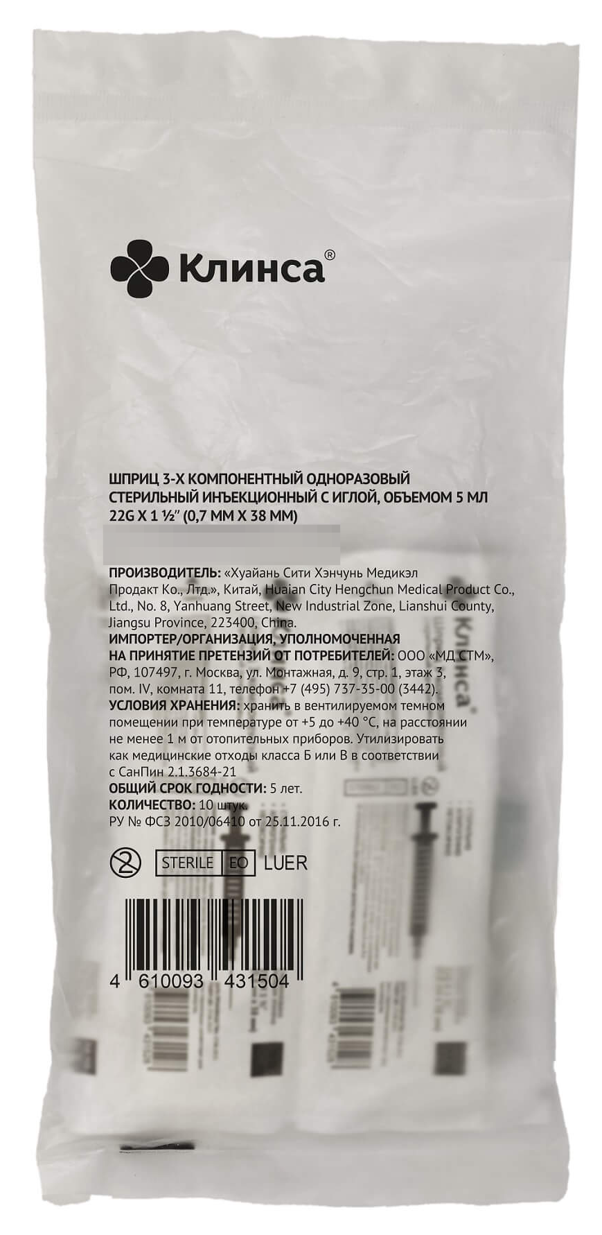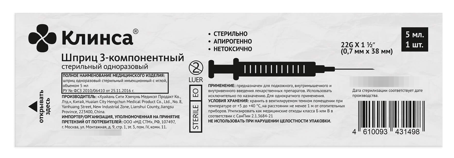 Шприц одноразовый, трехкомпонентный Клинса предназначен для подкожных, внутримышечных и внутривенных инъекций. Медицинский шприц нетоксичный, апирогенный, стерильный.