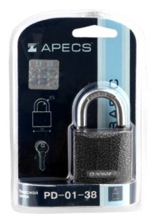 Замок навесной Apecs / Апекс PD-01-38 с автоматическим запиранием, чугунный, 3 ключа, дужка диаметром 6мм / средства защиты