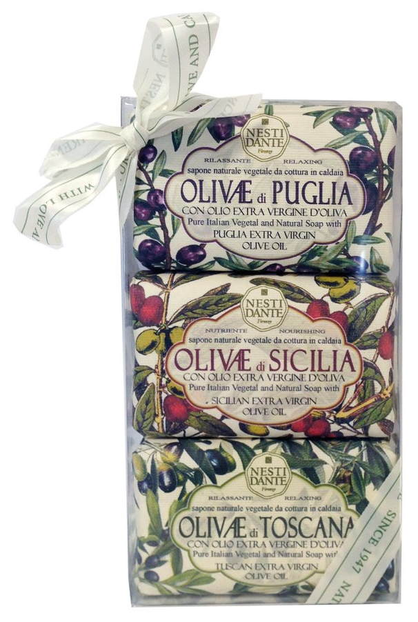 Nesti Dante — экологически чистое мыло, обогащенное растительными экстрактами и маслами. Производится во Флоренции с 1947 года по старинной котловой технологии варки мыла. Не содержит вредных поверхностно-активных веществ, сульфатов, парабенов, синтетических масел и искусственных красителей. Без аллергенов и ингредиентов животного происхождения. Мыло не размокает и быстро восстанавливается после длительного контакта с водой. Линия Olivae (Олива) олицетворяет оливковое дерево — символ жизни, мудрости, процветания, мира и долголетия. В знак признания к этому замечательному дереву Nesti Dante создал три вида мыла, вдохновленные сортами оливок из разных регионов Италии. Olivae di Puglia (Олива из Апулии), Olivae di Sicilia (Сицилийская олива), Olivae di Toscana (Тосканская олива) обогащены экстрактом листьев оливы (olea europaea leaf extract) — основной компонент оливы — олеуропеин — мощный антиоксидант. А также он содержат флавоноиды, витамины А, D, Е, К, значительное количество витамина С, лютеолин, танины, губильные вещества, органические кислоты.