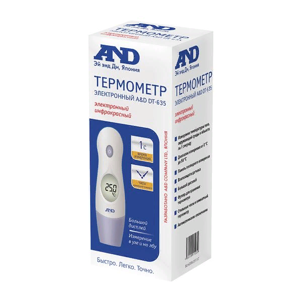 Термометр для тела AND / Эй энд Ди DT-635 без ртути инфракрасный лобный и ушной, в пластиковом футляре / медицинский градусник электронный
