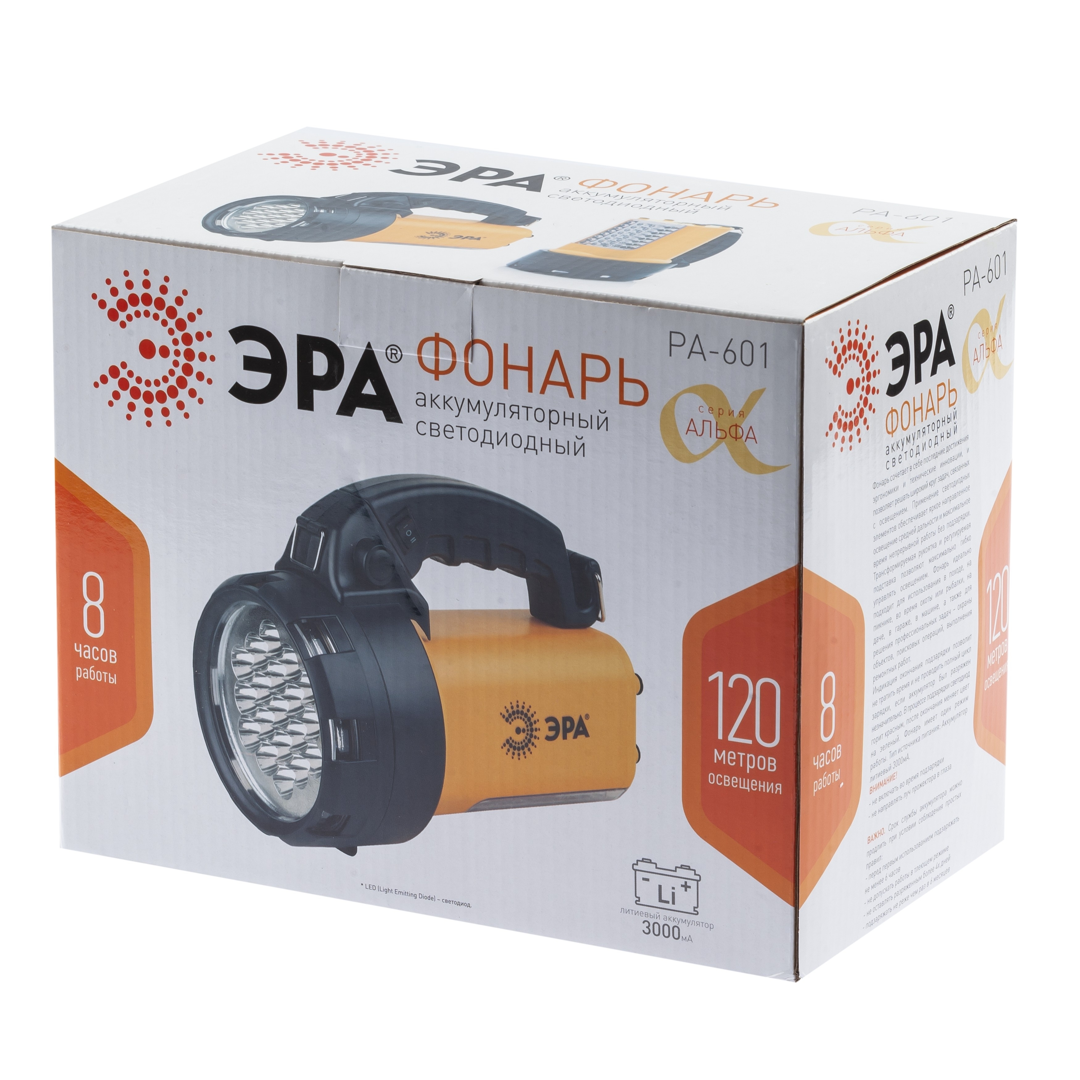 ЭРА РА-601 — мощный фонарь-прожектор на литиевом аккумуляторе. Ярко светит, долго держит заряд, при этом очень лёгкий. Помимо основного направленного света (19 светодиодов), имеет боковой светильник с широким заливающим освещением (24 LED-диода). Корпус фонаря изготовлен из ударопрочного пластика. Рукоятка имеет трансформируемую конструкцию — можно выбрать наиболее удобный формат работы с фонарём и его переноски. Ножки с прорезиненным покрытием обеспечивают устойчивость при использовании устройства в качестве походного светильника. В корпус встроен компас. ЭРА РА-601 идеально подходит для использования на природе (походы, пикники, охота, рыбалка), активно применяется в быту (дача, ремонт, гараж, автомобиль), решает профессиональные задачи (монтаж и строительство, охрана объектов, поисковые операции). В формате светильника успешно создаёт уютную атмосферу во время отдыха от работы или ужина на привале. РА-601 — представитель серии фонарей ЭРА Альфа. В прожекторах этой серии установлены сверхъяркие светодиоды последнего поколения, которые обеспечивают качественное освещение высокой дальности (данная модель светит на 120 метров). Литиевый аккумулятор с высокой ёмкостью (3000 мАч) гарантирует оптимальное время работы без подзарядки (4 активных часа). В комплекте поставляется ремень для удобной переноски и два устройства для подзарядки от сети: 220 В и 12 В (автомобильный прикуриватель).