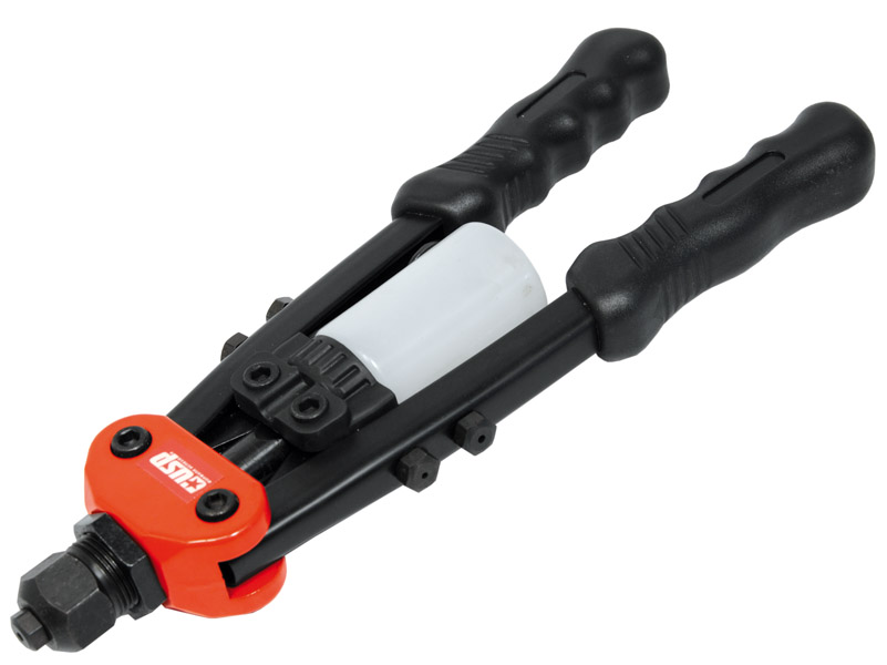 Для скрепления поверхностей вытяжными заклепками диаметром 2.4, 3.2, 4.0, 4.8 мм из алюминия, стали и нержавеющей стали. В комплектации пять сменных насадок для вытяжных заклепок и ключ для замены насадок. Снабжен специальным контейнером для сбора отработанных стержней заклепок. Вытяжной механизм с трехцанговым захватом из хромомолибденовой стали обеспечивает более долгий срок службы.
