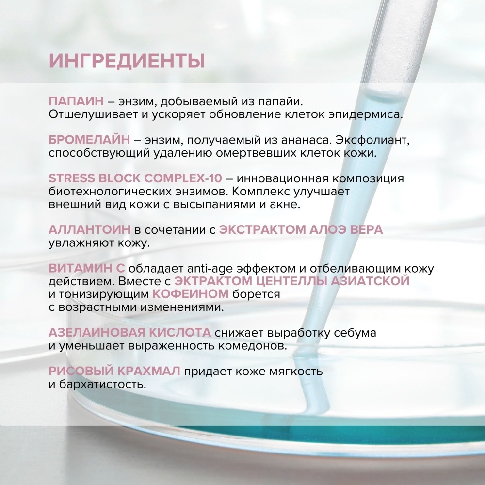 Папаин, бромелайн, Stress Block Complex-10, азелаиновая кислота, аллантоин, экстракт алоэ вера, витамин С, экстракт центеллы азиатской, кофеин, рисовый крахмал.