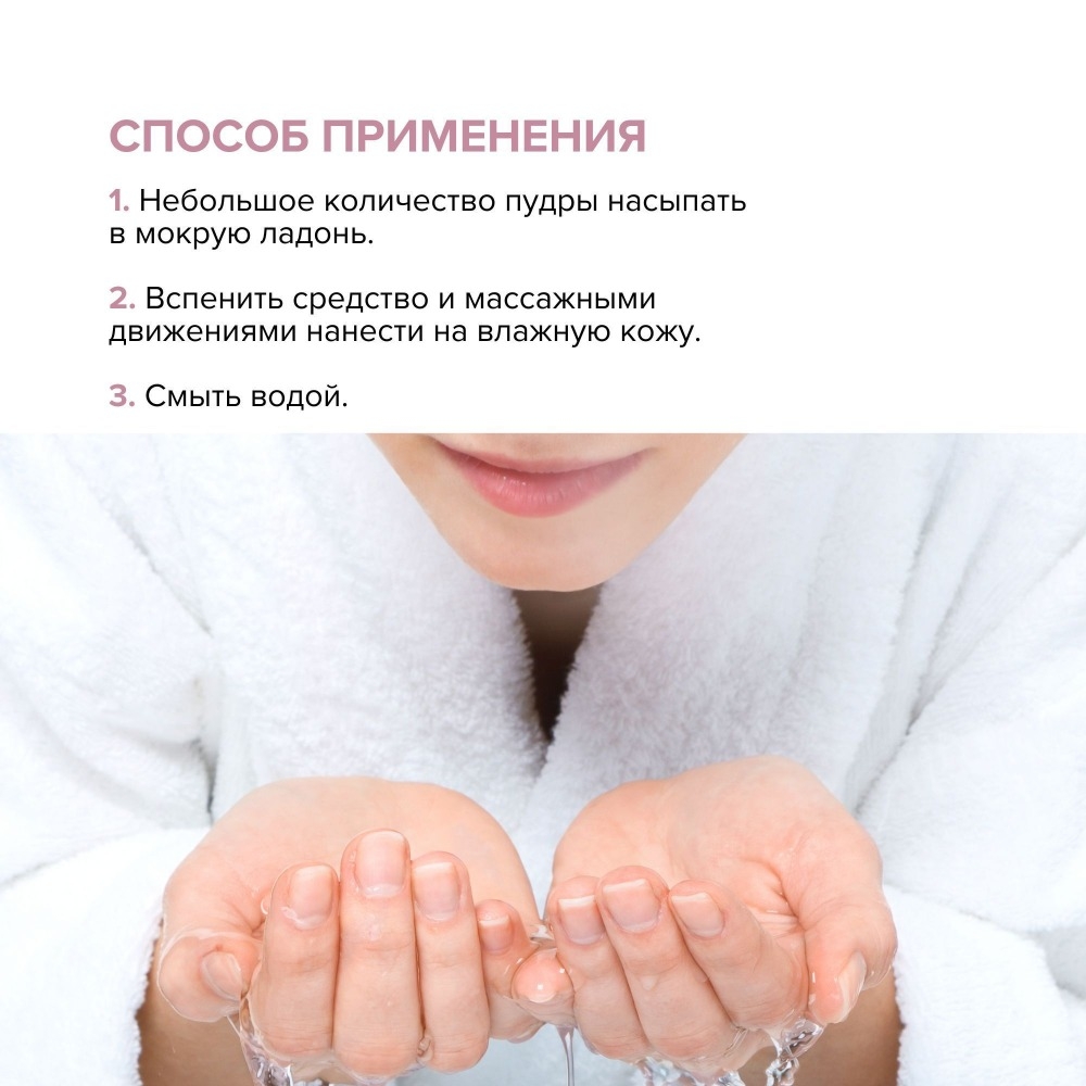 Небольшое количество пудры насыпать в мокрую ладонь. Вспенить средство и массажными движениями нанести на влажную кожу. Смыть водой. Для жирной кожи возможно ежедневное использование. Для нормальной, сухой и комбинированной - 1-3 раза в неделю.