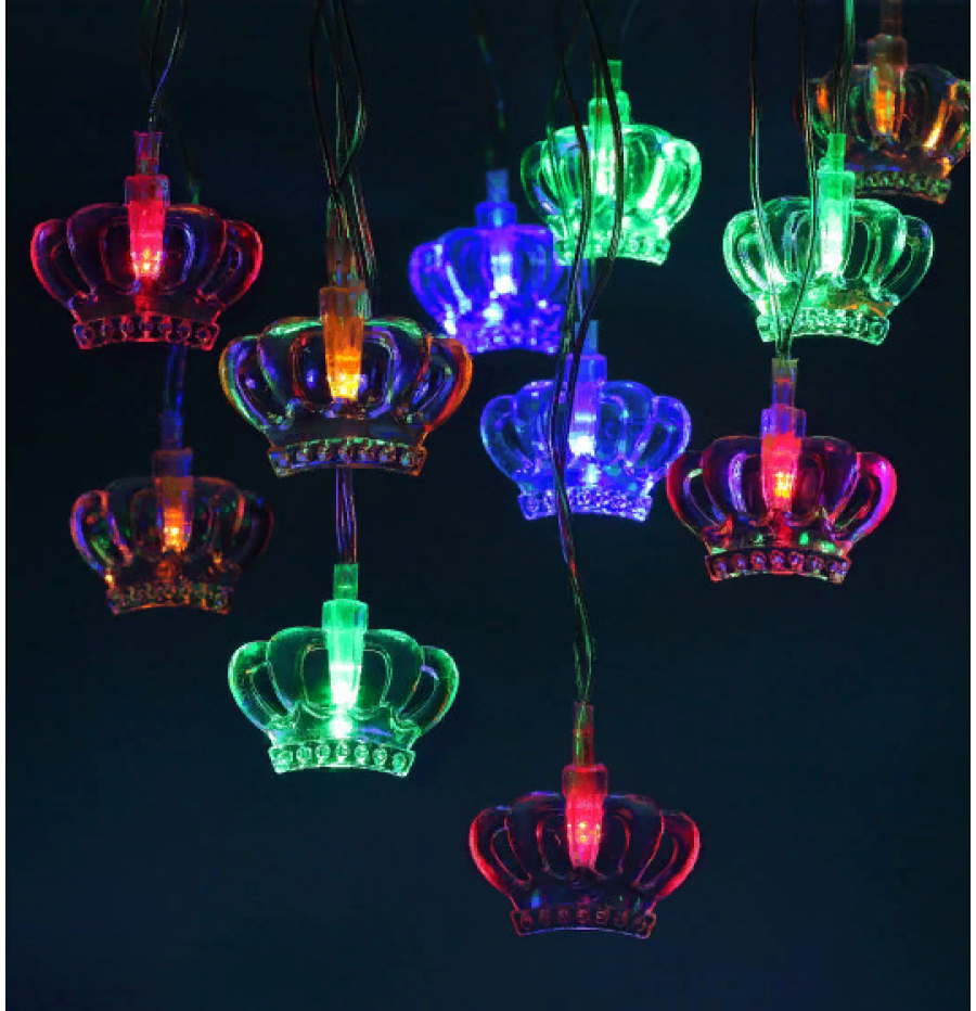 Новогодняя светодиодная гирлянда создана для необычной праздничной иллюминации. Практически незаметная днём, во включённом состоянии в темноте она светится разноцветными огоньками в форме корон.