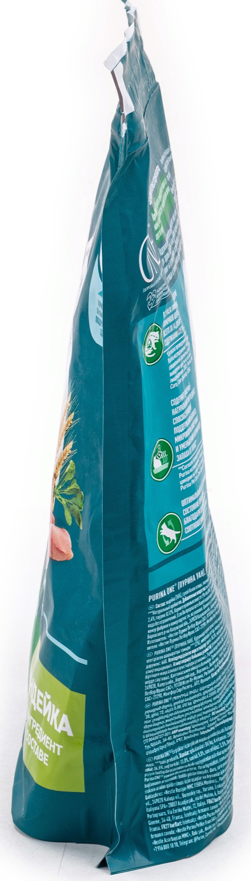 Корм для кошек Purina One c говядиной и цельными злаками реализуется в индивидуальной упаковке — пакете. Содержит в своем составе: индейка (17%), цельная пшеница (17%), сухой белок птицы, кукуруза, соевая мука, кукурузный глютен, пшеничный глютен, животный жир, высушенная мякоть свеклы, клетчатка, высушенный корень цикория (2%), минеральные вещества, вкусоароматическая кормовая добавка, дрожжи, консерванты, витамины, антиоксиданты.