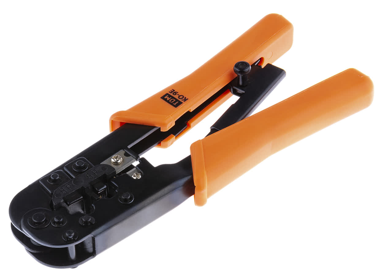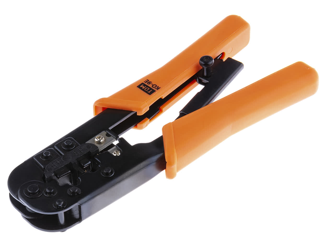 Подготовить кабель к дальнейшему использованию можно с помощью специального инструмента. Сюда в полной мере относятся обжимные клещи TDM Electric КО-9Е. Они применяются для работ по обжимке телефонных кабелей и компьютерных разъемов RJ.