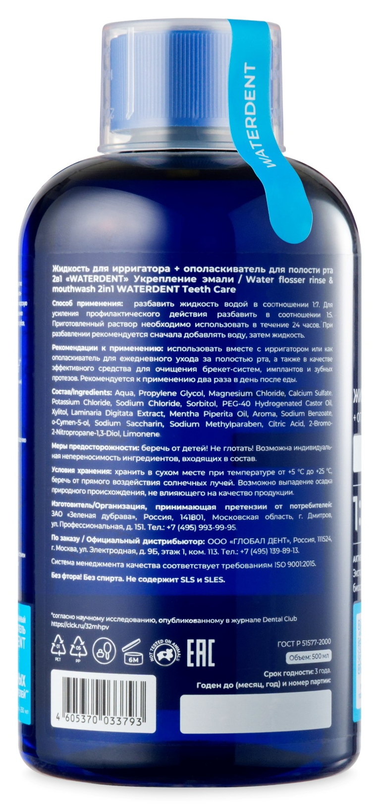 Waterdent / Вотердент Ополаскиватель для полости рта+жидкость для ирригатора 2в1 Укрепление эмали, от кариеса, с экстрактом ламинарии 500мл / средство для защиты десен