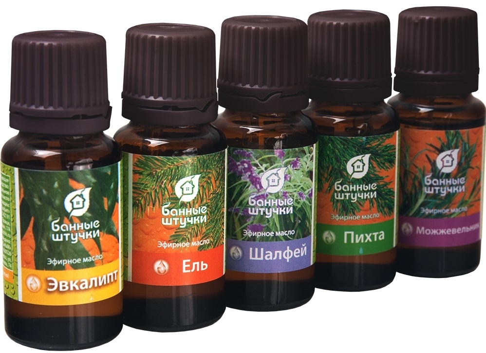 Банный набор реализуется в индивидуальной упаковке. В его состав входят эфирные масла, 5шт.: Пихта, Можжевельник, Ель, Шалфей, Эвкалипт.