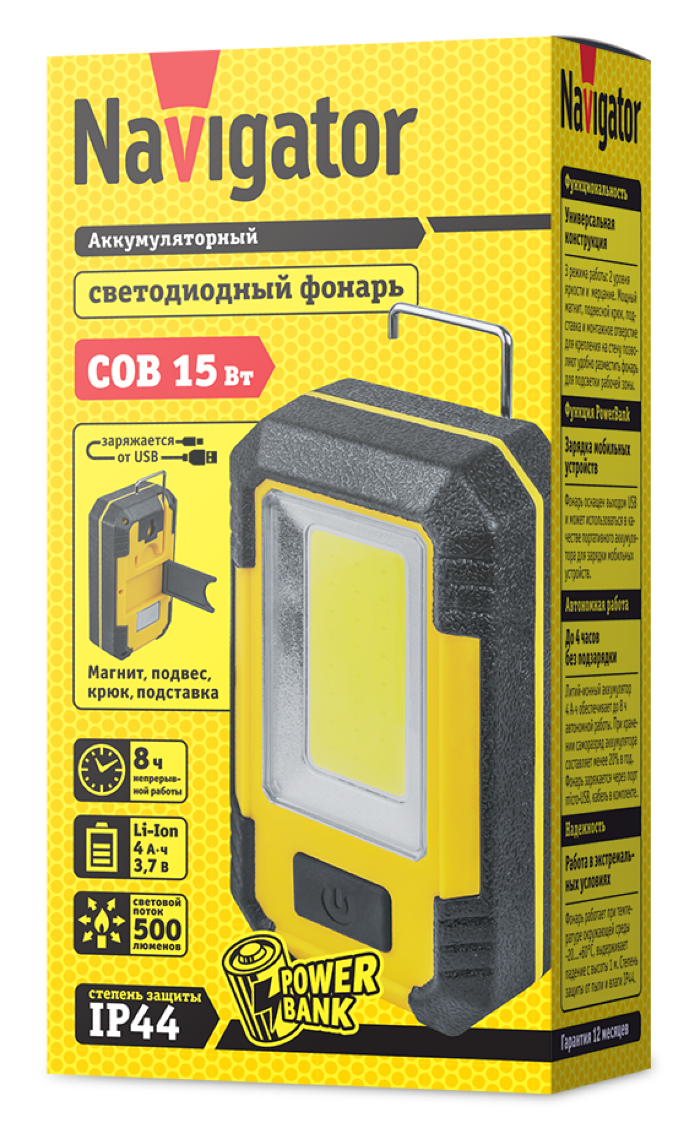 Несомненным плюсом фонаря для путешествий Navigator NPT-W02 является бесперебойная работа. Достаточно подзарядить фонарик в течение нескольких часов