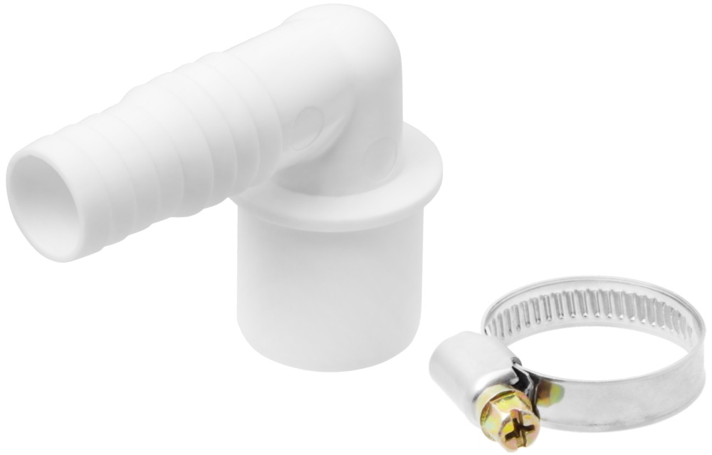 Комплект для подключения сливного шланга стиральных и посудомоечных машин: штуцер угловой с хомутом. Диаметр внешний 20/23/32 мм. Переходник помогает присоединить сливной шланг к фитингу внутренней канализации, что обеспечивает слив воды из бытовой техники.