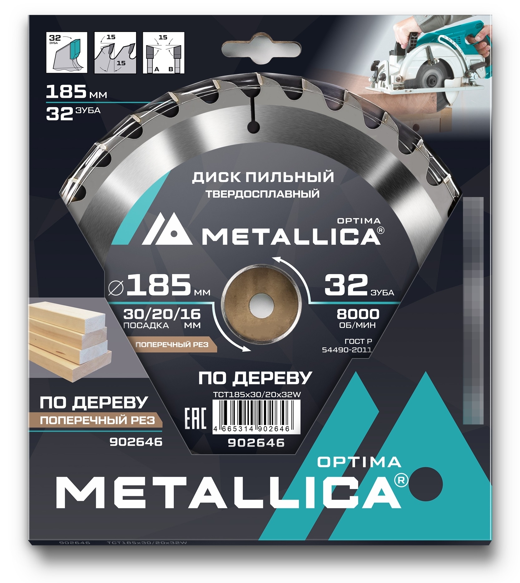 Диск пильный твердосплавный предназначен для продольной и поперечной распиловки мягкой и твердой древесины, а также фанеры, ДСП, OSB циркулярной пилой. Изготовлен из пружинной стали 65Г с последующей закалкой корпуса до твердости 40-45 HRC. Корпус имеет специальные прорези для компенсации теплового расширения, возникающего в процессе работы. Металл-композитные твердосплавные режущие зубы, изготовленные из карбида вольфрама марки ВК-8 твердостью 90-91 HRA припаяны к корпусу серебряным припоем. Угол атаки зуба +15 град., чередующаяся косая алмазная заточка зубов обеспечивает идеальное срезание древесных волокон. Достаточное расстояние между зубами обеспечивает необходимый отвод опилок для оптимальной работы, как вдоль, так и поперек волокон.