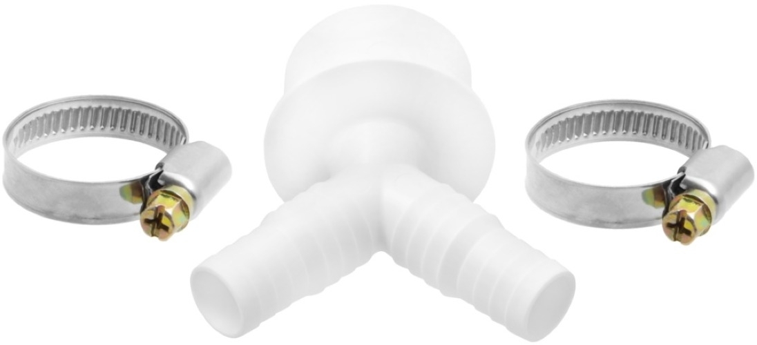 Комплект для подключения сливного шланга стиральных и посудомоечных машин: штуцер двойной с двумя хомутами. Диаметр внешний 20/23/50 мм. Переходник помогает присоединить сливной шланг к фитингу внутренней канализации, что обеспечивает слив воды из бытовой техники.