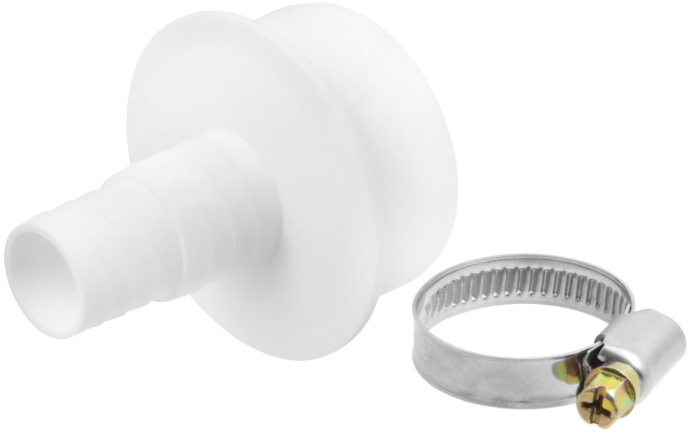 Комплект для подключения сливного шланга стиральных и посудомоечных машин: штуцер прямой с хомутом. Диаметр внешний 20/23/50 мм. Переходник помогает присоединить сливной шланг к фитингу внутренней канализации, что обеспечивает слив воды из бытовой техники.