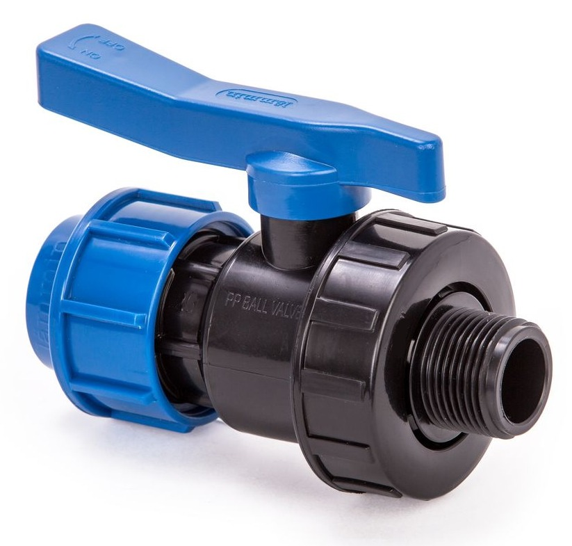 Кран шаровой компрессионный с наружной резьбой предназначен для перекрытия или регулировки потока транспортируемой жидкости в системах, где используются полиэтиленовые трубы при прокладке систем полива, систем орошения, подвода холодной воды в частном и городском строительстве. Наличие цангового зажима у шарового крана позволяет соединить трубу напрямую, без использования компрессионных переходников, а запорный механизм в виде пластикового шара, обеспечивает надежную работу крана на долгие годы.