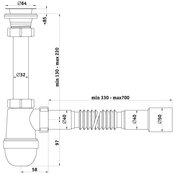 Комплектация: сифон с литым выпуском, гибкая труба для подключения к канализации 40х40/50мм.