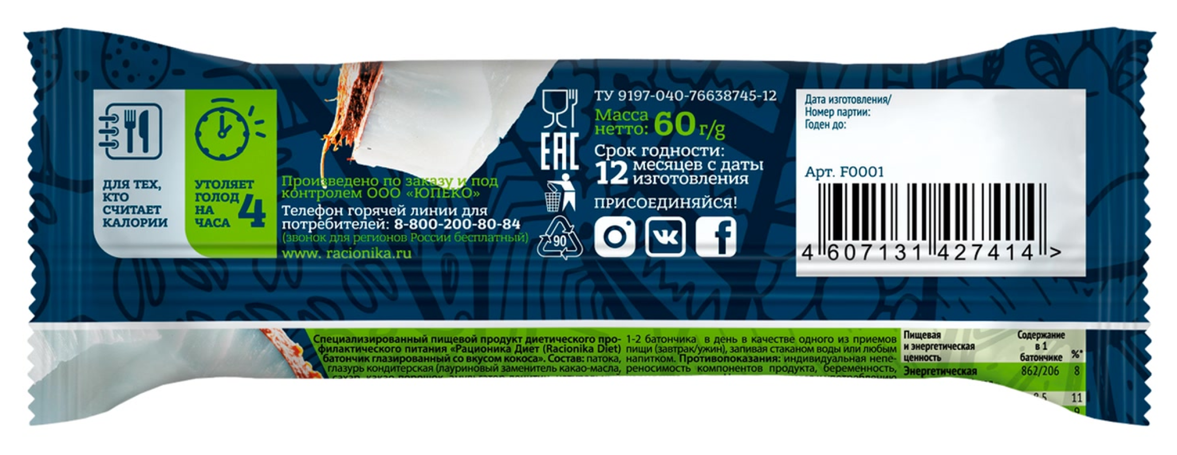 Батончик Racionika Diet реализуется в индивидуальной упаковке. В его составе содержатся следующие компоненты: патока, глазурь кондитерская (лауриновый заменитель какао-масла, сахар, какао-порошок, эмульгатор лецитин, натуральный ароматизатор), кокосовая стружка, пищевые волокна (инулин, волокна пшеницы, волокна акации), молочный белок, соевый белок, фруктоза, влагоудерживающий агент глицерин, подсластитель натуральный стевия, витаминно-минеральная смесь (кальций, магний, цинк, витамины В1, В6, РР), регулятор кислотности лимонная кислота, консервант сорбат калия, натуральный ароматизатор. Вес — 60 г.