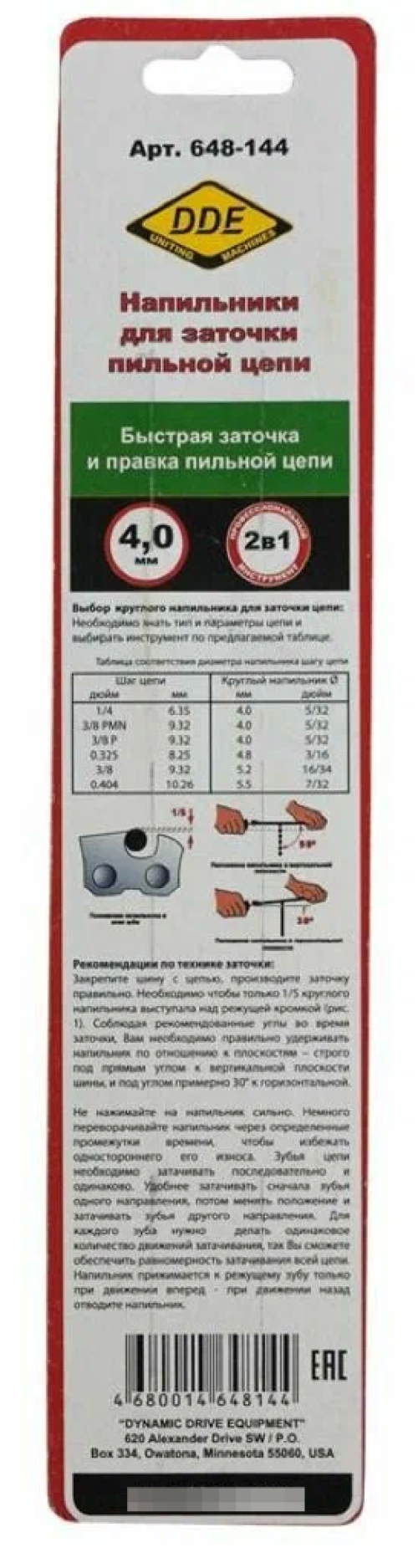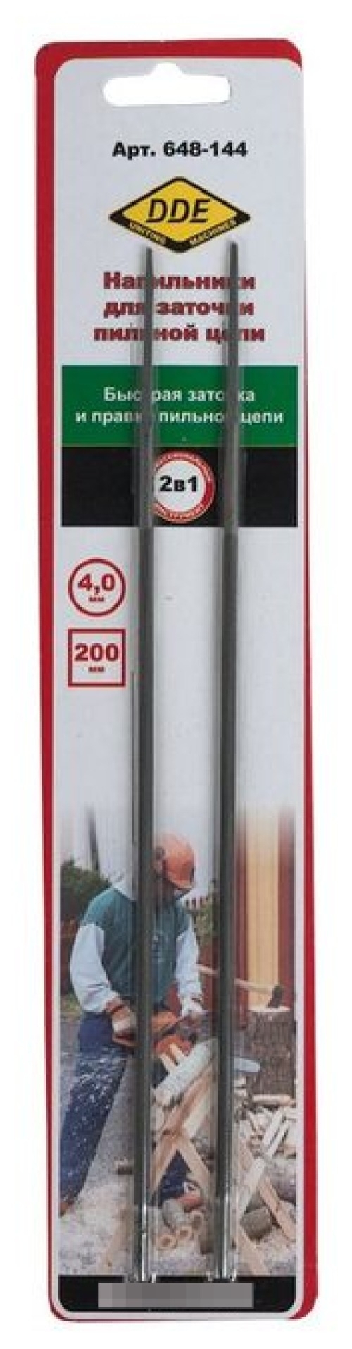 Напильник круглый 4,0 мм - 5/32 DDE 648-144 используется при заточке и правке пильных цепей, не снимая их с бензопилы. Напильник подходит для заточки цепей с шагом 1/4", 3/8 PMN, 3/8 P. Поставляется в блистере, в комплекте 2 шт.