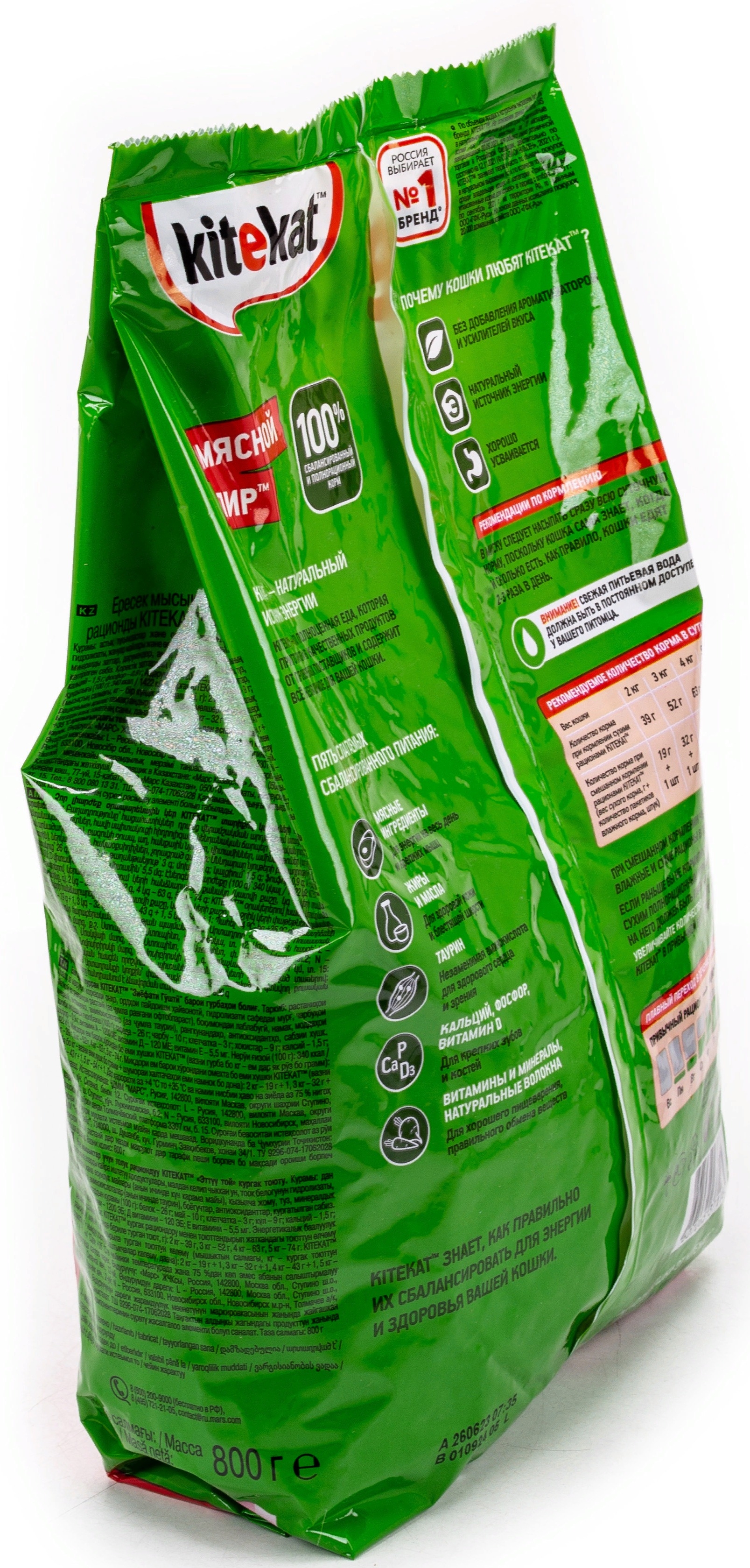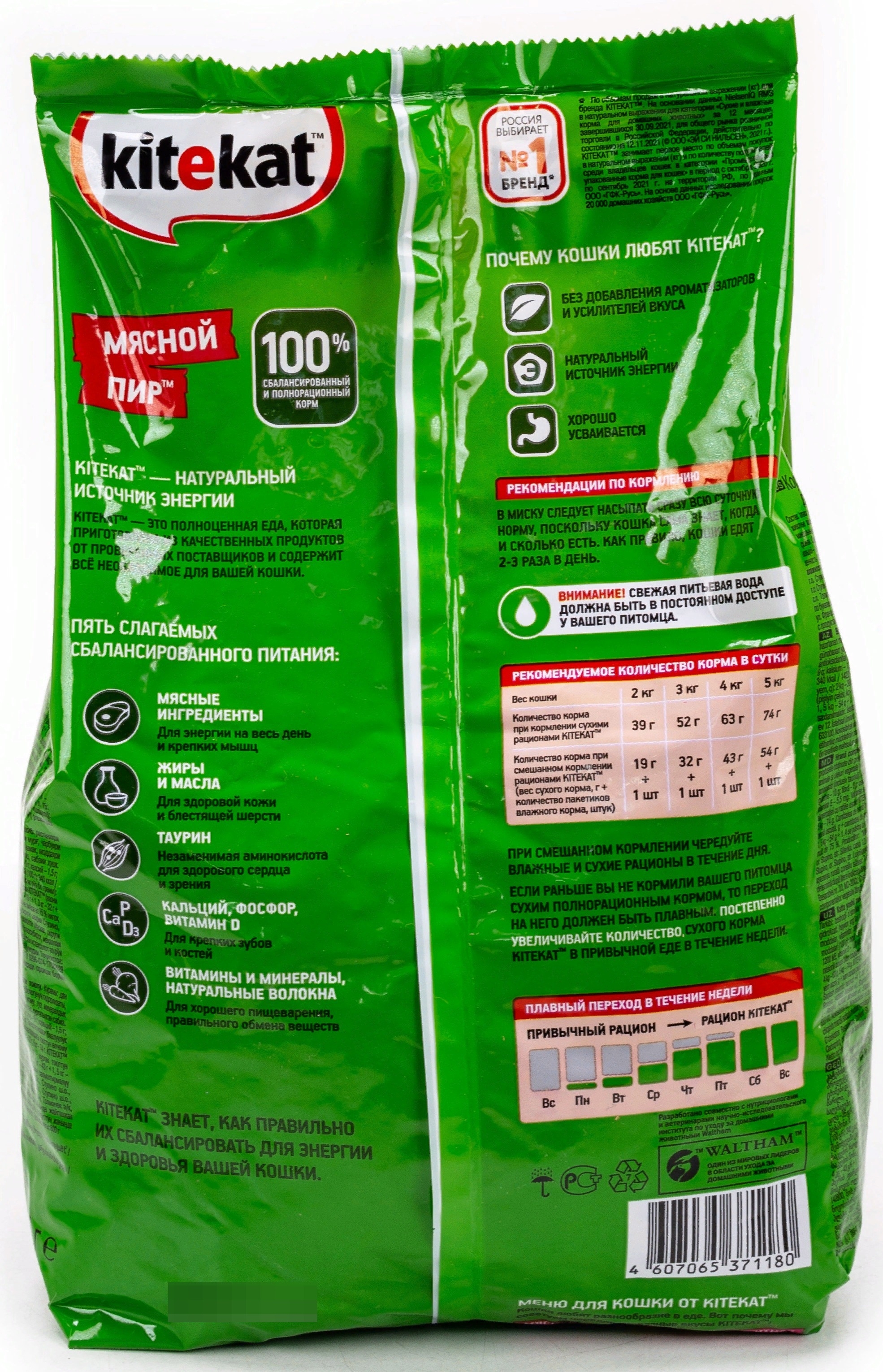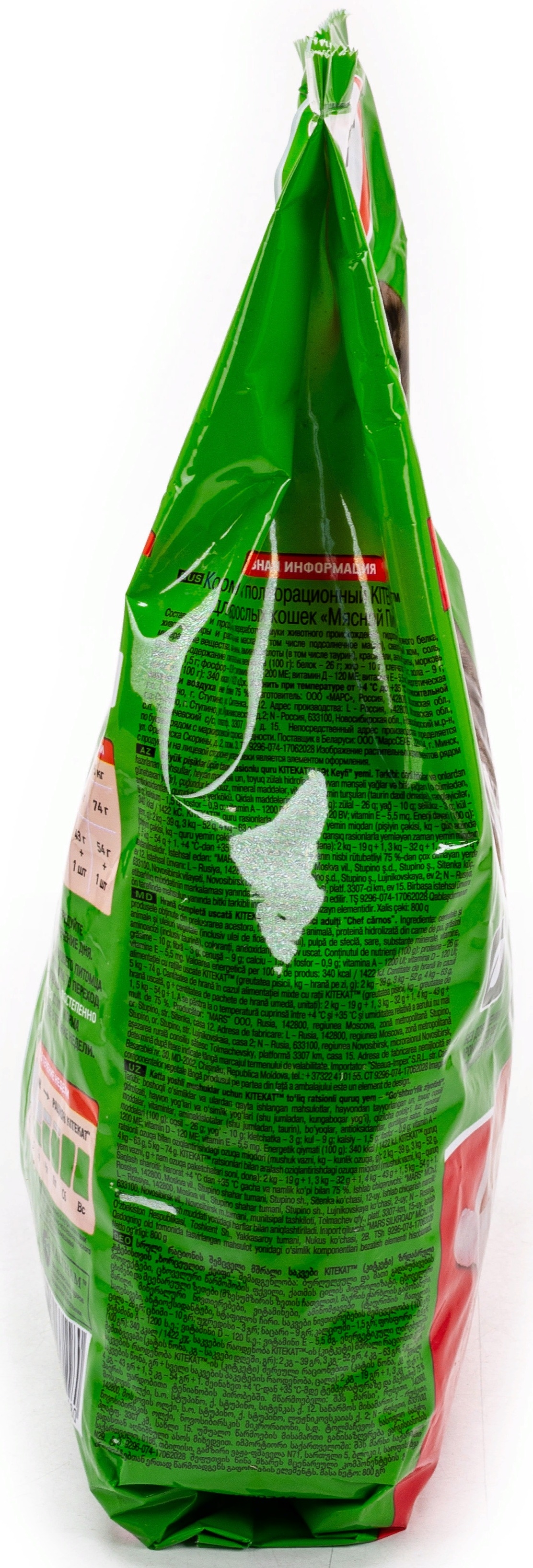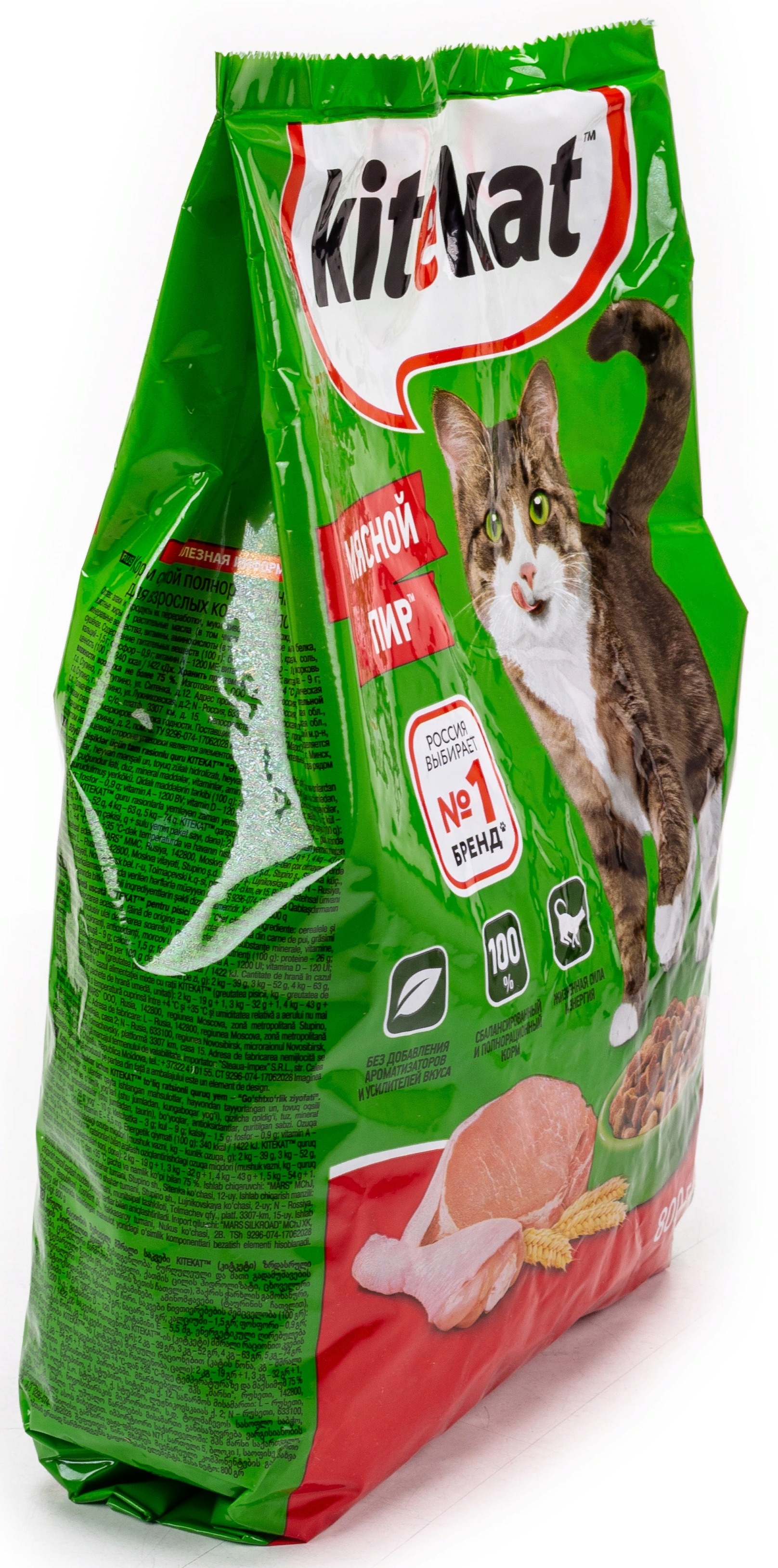 Корм для кошек Kitekat Мясной пир реализуется в индивидуальной упаковке — пакете. Содержит в своем составе: злаки и продукты их переработки, муку животного происхождения, гидролизат куриного белка, животные жиры и растительные масла (в том числе подсолнечное масло), свекловичный жом, соль, минеральные вещества, витамины, аминокислоты (в том числе таурин), красители, антиоксиданты, морковь сушёную.