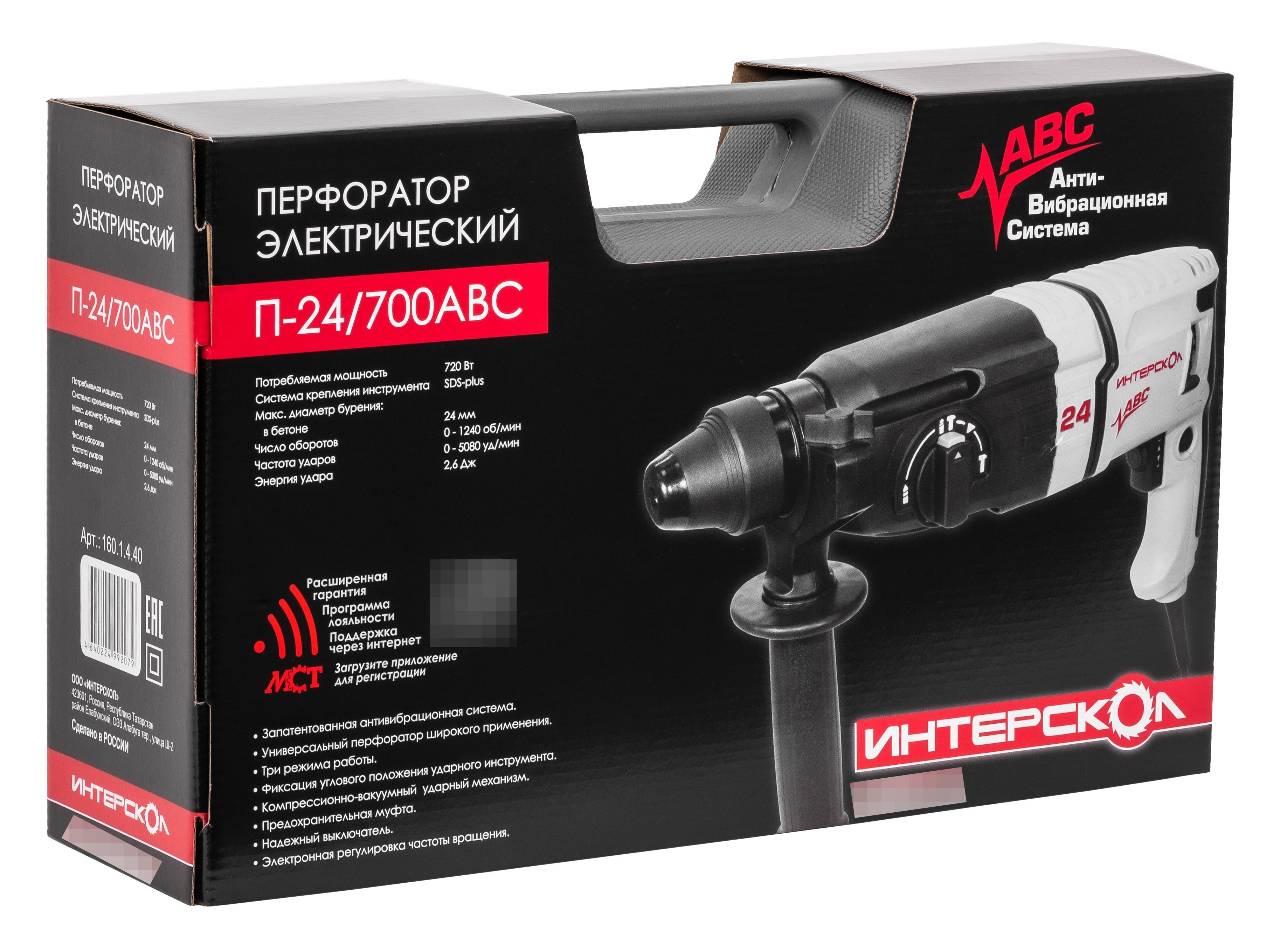 - Перфоратор Интерскол П-24/700АВС в пластиковом кейсе щеточный, серо-черный, SDS+, 3 режима работы, 2.6Дж, 700Вт - 1шт.