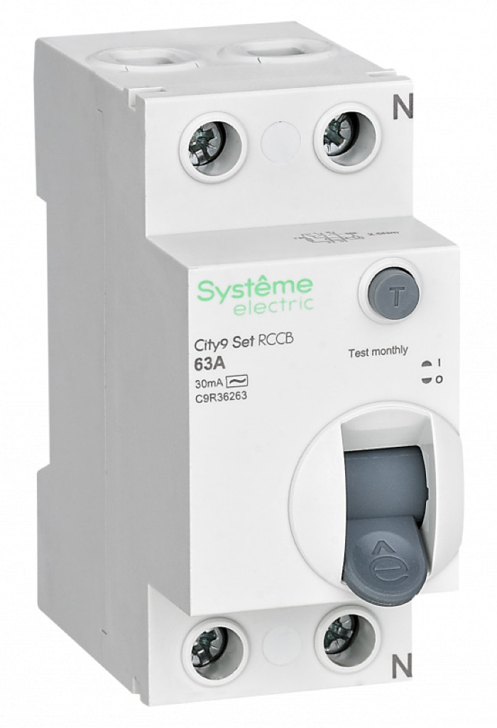 - Устройство защитного отключения Systeme Electric City9 Set двухполюсный, в пластиковом корпусе, белый, 63A 30мА IP20 тип AC, C9R36263 - 1шт.