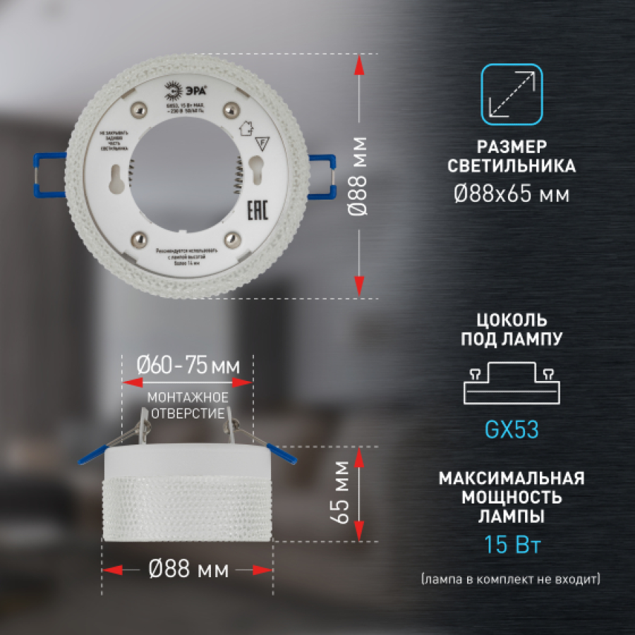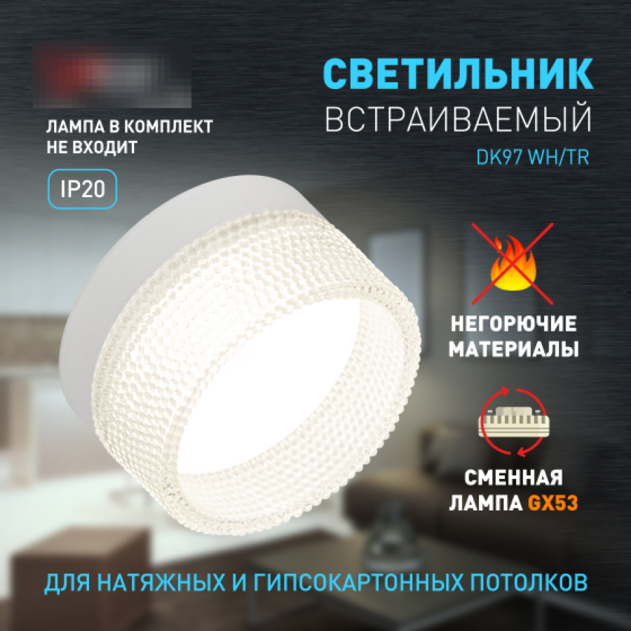 - Светильник встраиваемый точечный ЭРА DK97 WH/TR под лампу GX53, IP20, размер 88х65мм белый прозрачный, Б0057456 - 1шт.