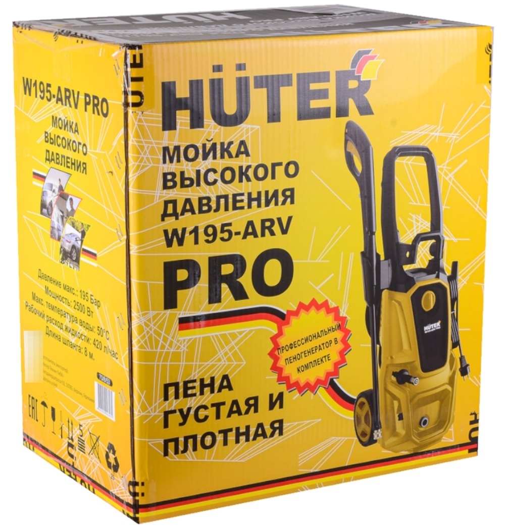Мойка высокого давления Huter W195-ARV с мощностью электропривода 2500 Вт питается от сети 220 Вт и оснащается металлическими поршнями, металлическим корпусом помпы. Она допускает использование воды с температурой до 50 градусов Цельсия и моющего средства.