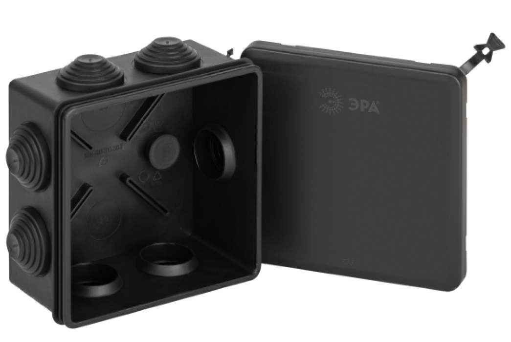 Распаячная коробка ЭРА имеет интересный дизайн, выполнена в черном цвете. Предназначена для разветвления проводов и кабеля, защищают от сырости и механических повреждений мест соединения электропроводных кабелей.