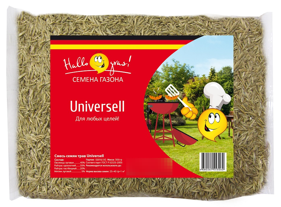 Семена газона UNIVERSELL в маленькой упаковке весом 0,3 кг подойдет, чтобы подсыпать семена на небольшом участке или провести ремонт проплешины. UNIVERSELL серии «Hallo, gras!» — это универсальная травосмесь для быстрого создания газона на различных территориях. Хорошо произрастает на открытых солнечных и затененных участках. Для любых целей! Упаковка весом 300 гр подойдет для участка под газон площадью 10 м2.