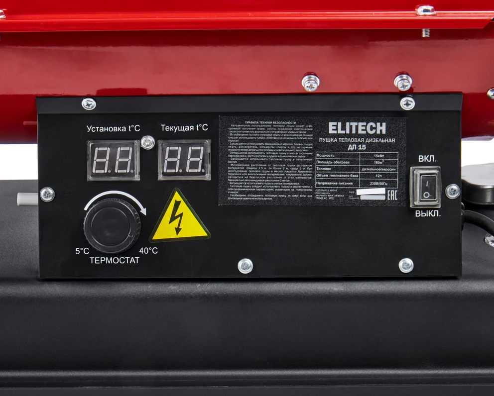 Тепловая пушка Elitech / Элитек ДП 15 дизельная, в стальном корпусе, 610x200x425мм, 15кВт, 160м², 500м³/ч, IP 10 / отопление