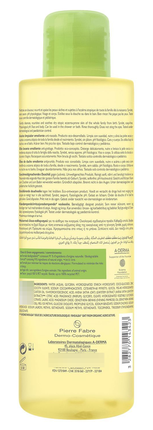 A-Derma Exomega Control Смягчающее масло для душаДеликатное средство для очищения сухой, склонной к атопии кожи для всей семьи: младенцы, дети, взрослые. Смягчающее масло очень нежно очищает, увлажняет и смягчает сухую, склонную к атопии и зуду кожу младенцев, детей и взрослых благодаря содержанию в составе экстракта ростков овса Реальба и Омега 6 незаменимых жирных кислот. Уникальный запатентованный ингредиент — экстракт ростков овса Реальба эффективно успокаивает и снимает раздражение с кожи. Реальба — это особый сорт овса, известен своими уникальными свойствами. Реальба обеспечивает эффективную защиту кожи и высокую переносимость благодаря богатству активными ингредиентами. Органическое происхождение ингредиента Реальба гарантирует отсутствие пестицидов, фунгицидов и ГМО, бережный уход за кожей. Протестировано под контролем дерматологов и педиатров. Биоразлагаемая формула.