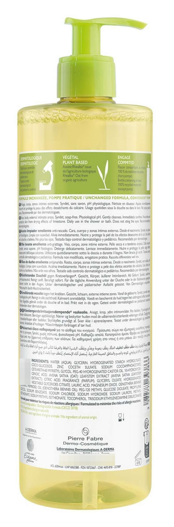 Продукт реализуется в индивидуальной упаковке в емкости на 750 мл. Масло косметическое A-Derma изготавливается на основе 100% натуральных и безопасных компонентов.