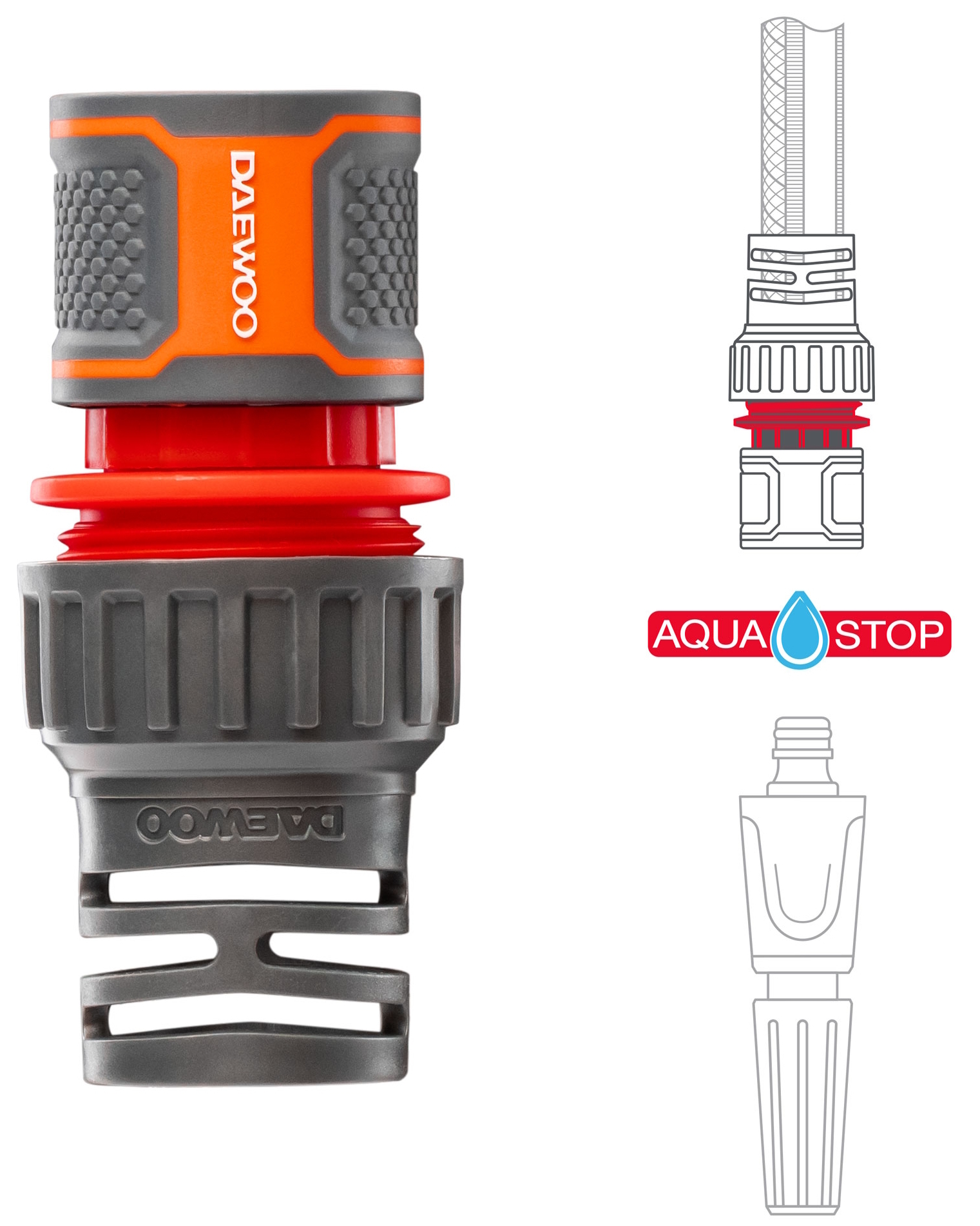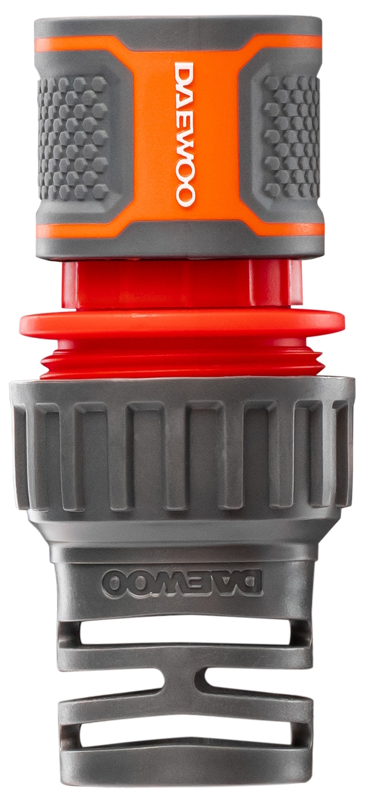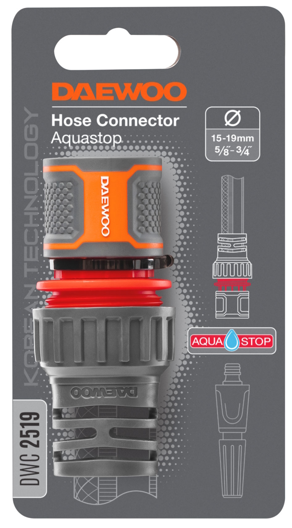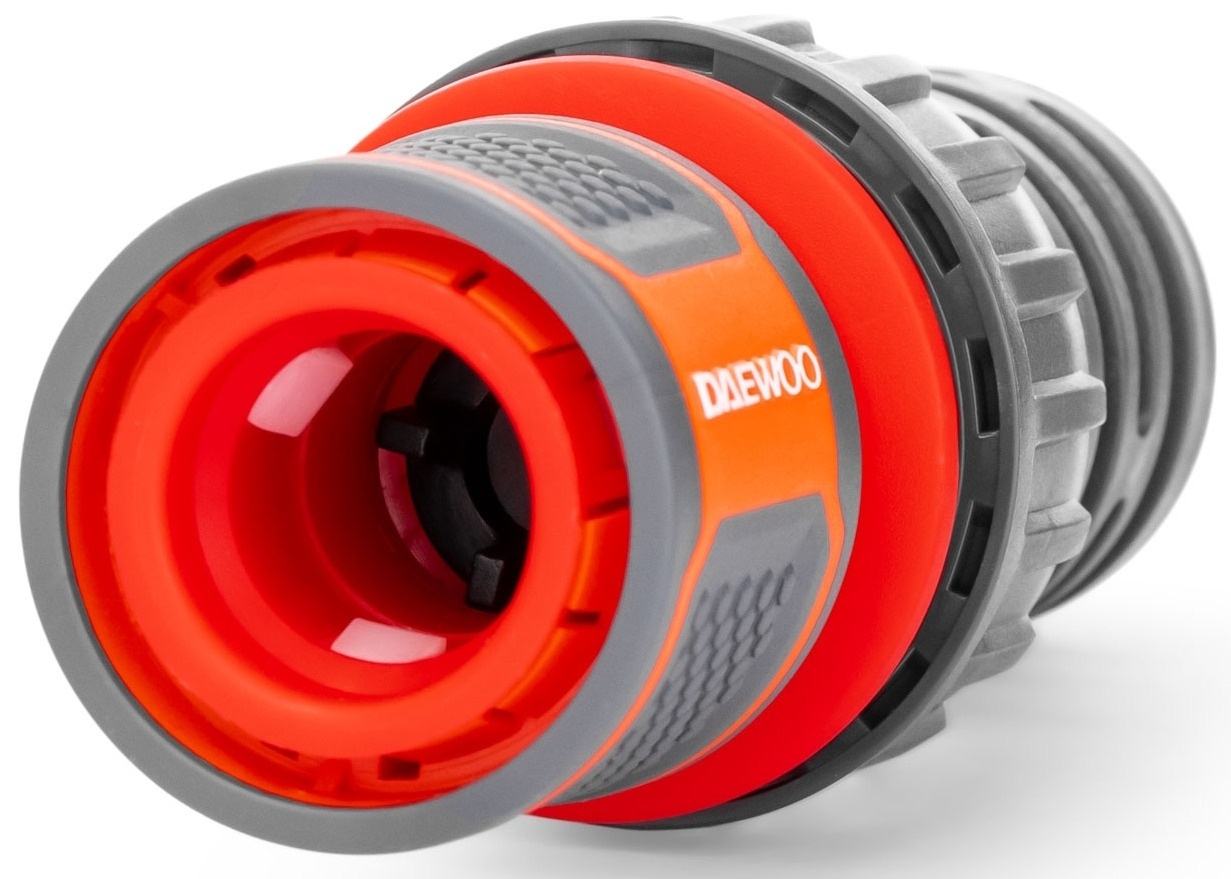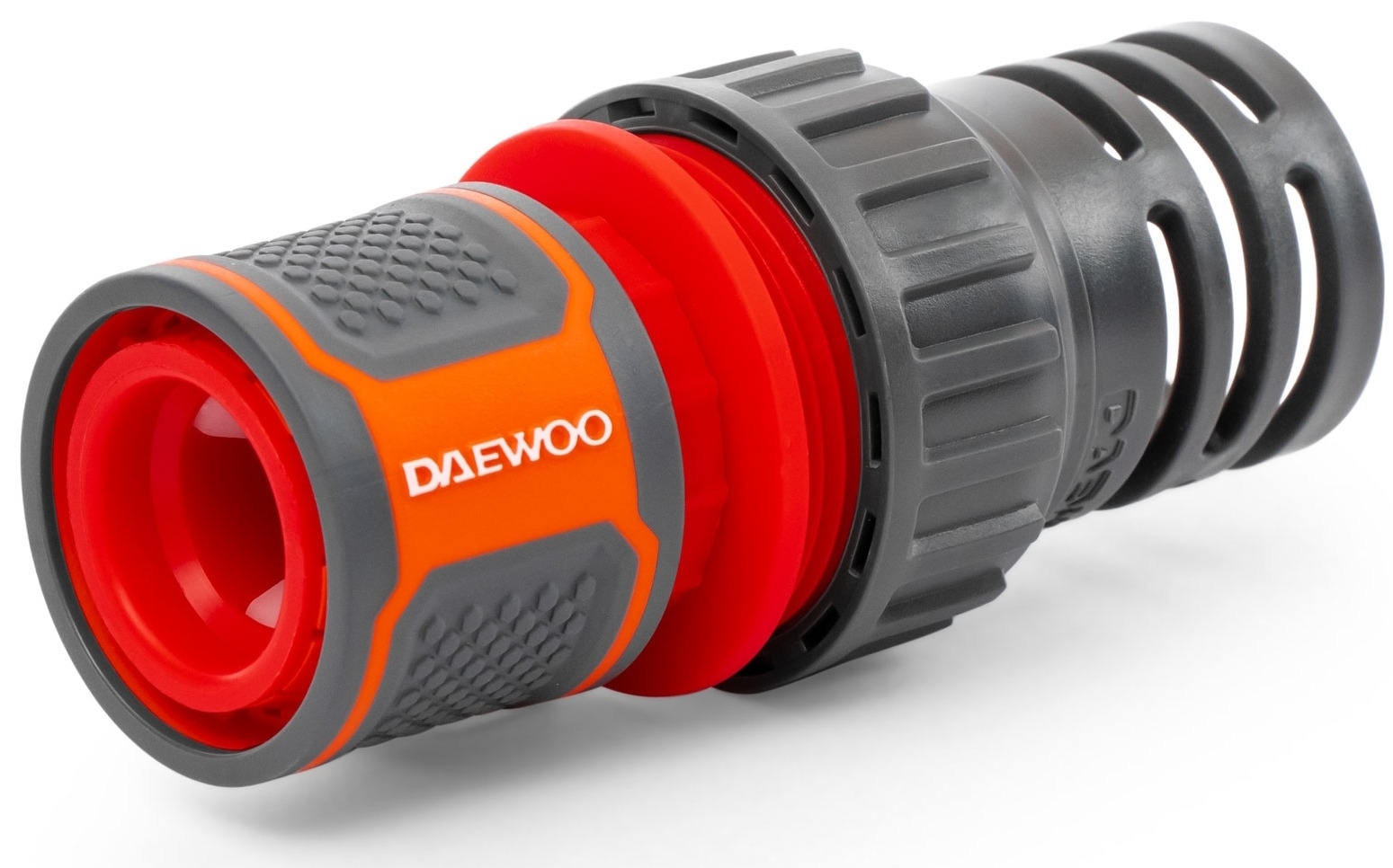 Коннектор для шланга с аквастопом Daewoo DWС 2515 позволяет быстро подключить шланг диаметром 15-19мм (5/8"-3/4") к разбрызгивателю или другой насадке.