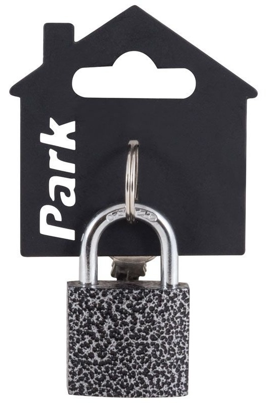 Замок навесной Park ВС3Р32 материал: сталь, покрытие ключевой механизм - латунь, 3 ключа в комплекте, размер корпуса: 2,9 х 3,2 х 1,4 см, размер дужки: d 0.91 х h 2,5 см, размер замка: 5,3 х 3,2 х 1,4 см, упаковка пластиковый подвес в виде домика и п/э пакет.