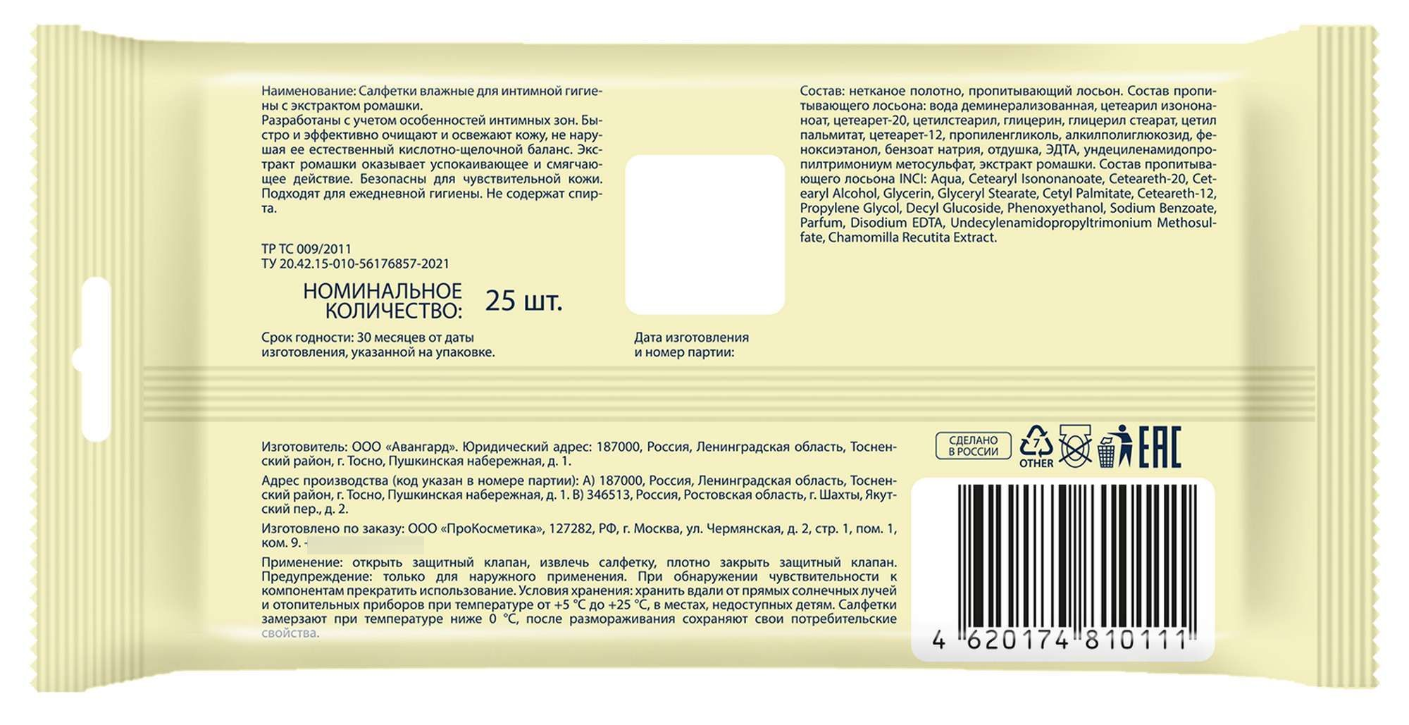 Влажные салфетки для ухода за интимными участками тела. Они выполнены из нежного материала, пропитанного специально разработанным лосьоном, и позволяют очищать кожу, не нарушая естественный кислотно-щелочной баланс интимной зоны. Экстракт ромашки оказывает успокаивающее и увлажняющее действие.