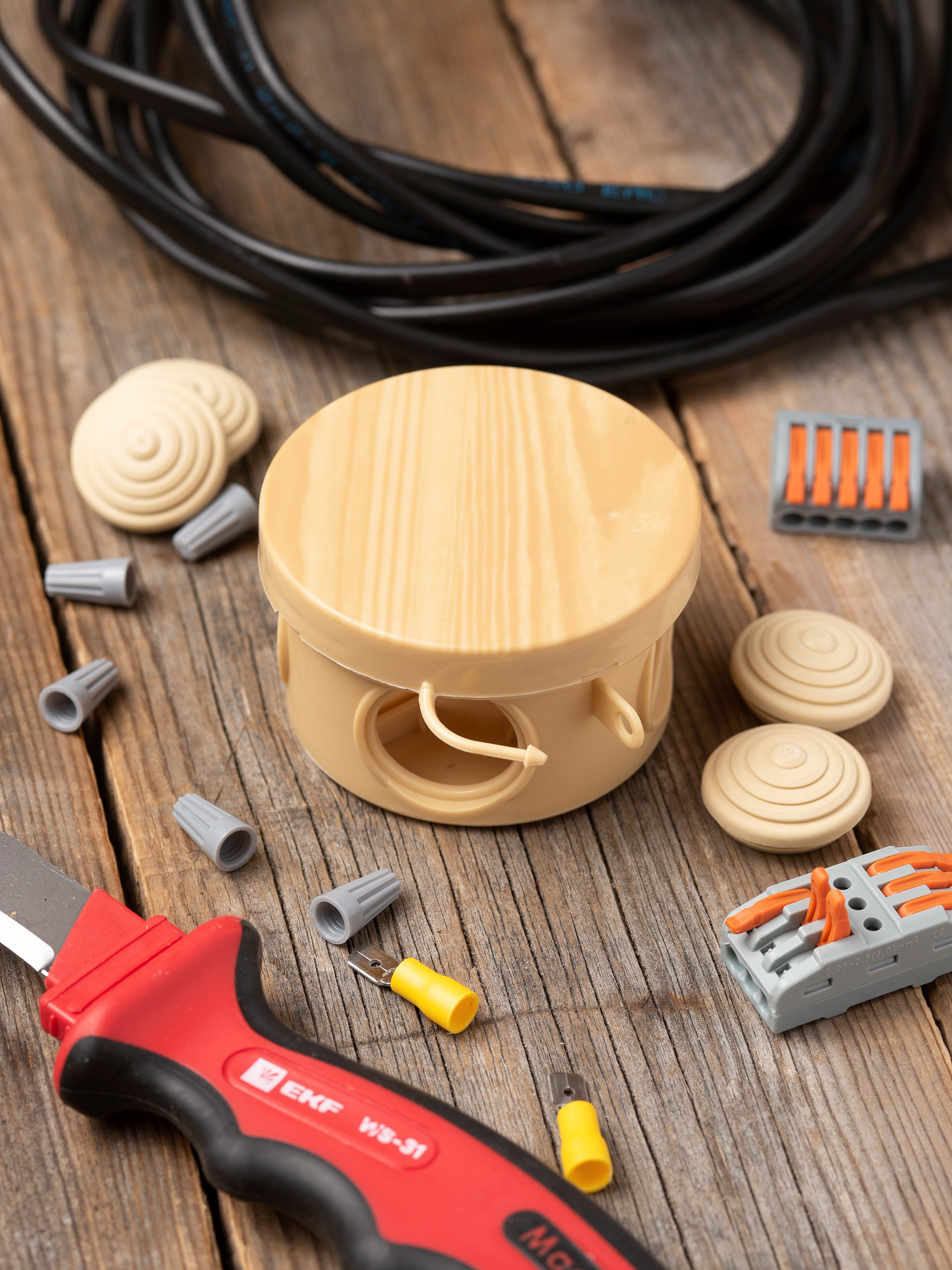 Распаячная коробка EKF ROxima КМР-040-038 имеет интересный дизайн, выполнена в цвете светлое дерево. Она прекрасно впишется в любой интерьер и скроет неприглядные стыки.