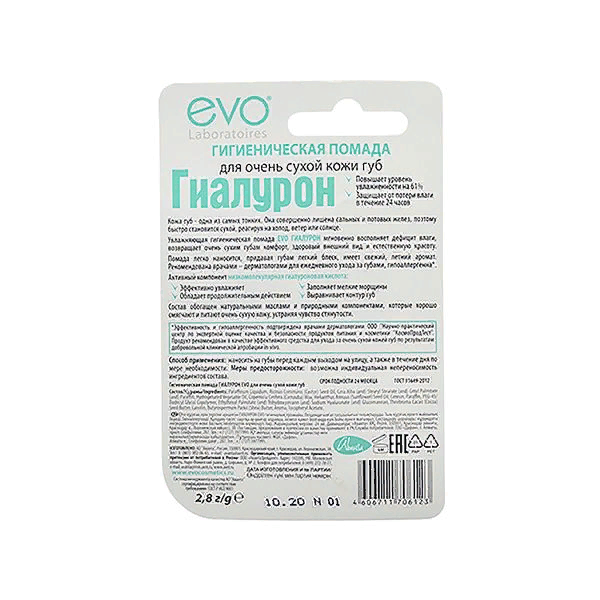 Увлажняющая гигиеническая помада для губ Evo Гиалурон мгновенно восполняет дефицит влаги, возвращает очень сухим губам комфорт, здоровый внешний вид и естественную красоту. Помада легко наносится, придавая губам легкий блеск, имеет свежий, летний аромат. Рекомендована врачами-дерматологами для ежедневного ухода за губами, гипоаллергенна. Состав обогащен натуральными маслами и природными компонентами, которые хорошо смягчают и питают очень сухую кожу, устраняя чувство стянутости.